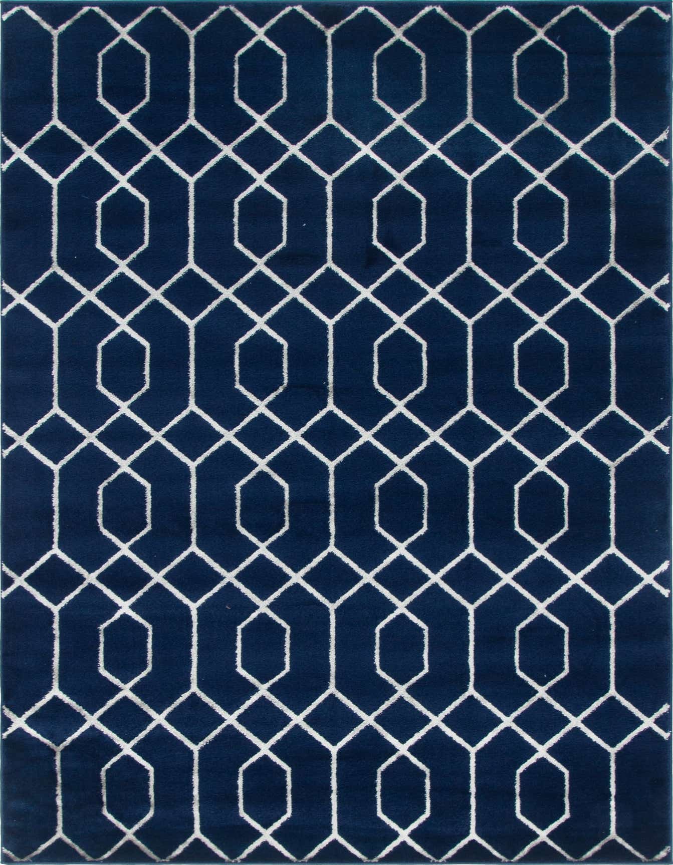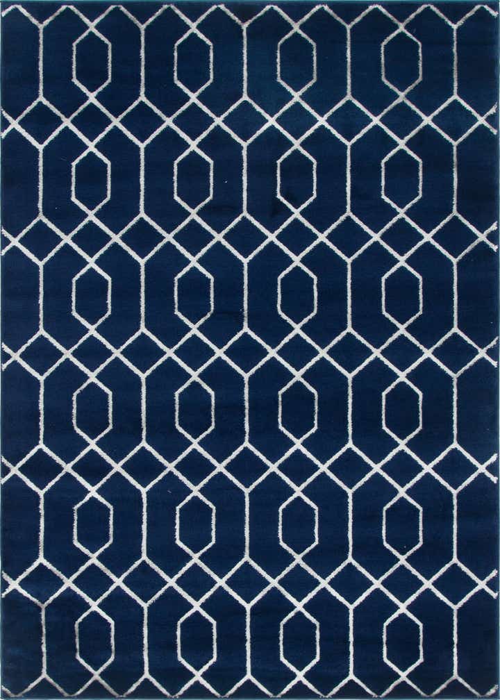 A 4x6 rectangular blue area rug with a white Hollywood glam trellis pattern, ideal for a living room or office.