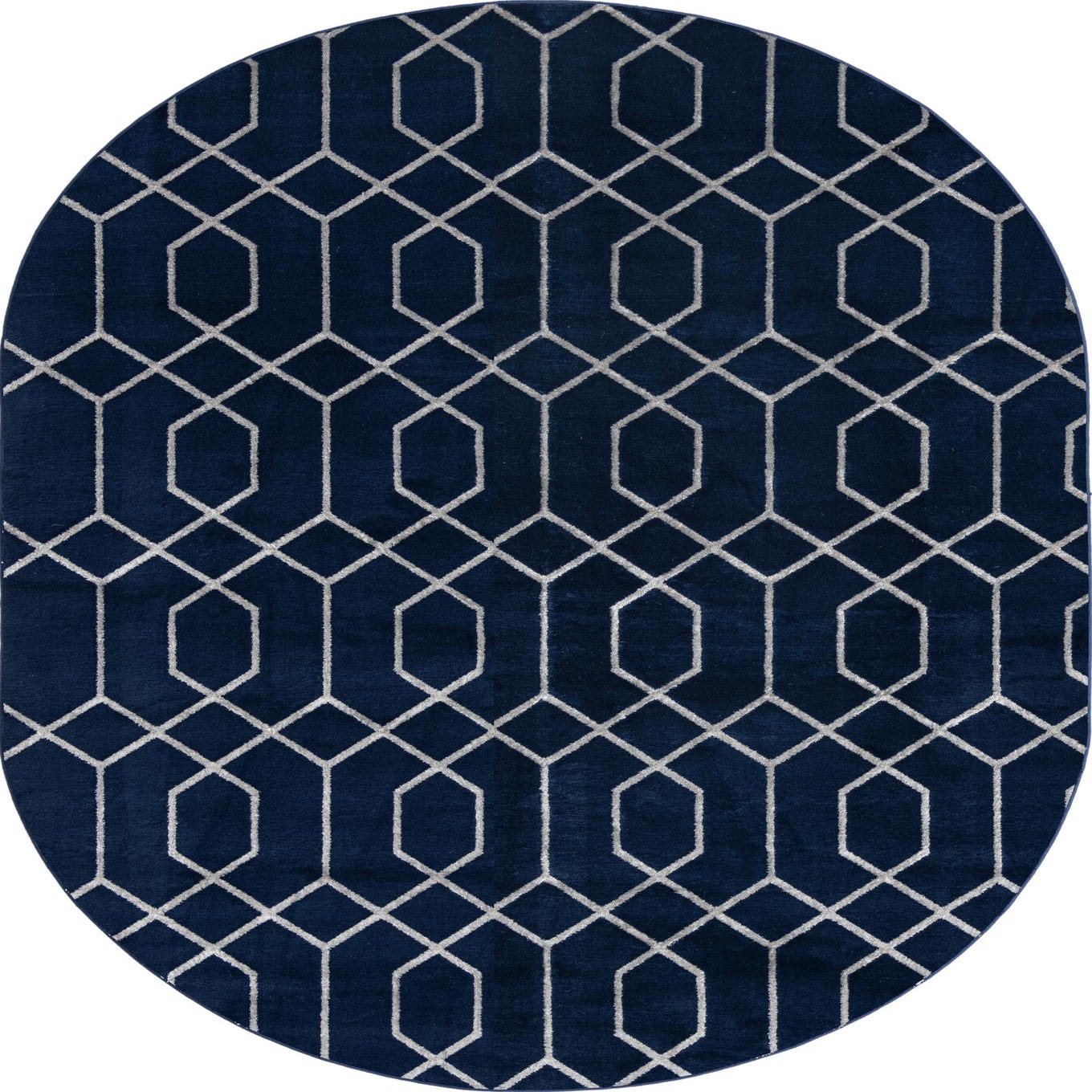 This oval shape works well in contemporary or transitional rooms that welcome graphic patterning without excess. Place it beneath a small round dining table or in an entry to define the space, layer it at the foot of a bed for a tailored look, or use it in a home office to anchor seating with a touch of metallic accent. Pair with light gray or cream upholstery, brushed chrome or nickel hardware, and warm wood tones to balance the navy and silver palette.