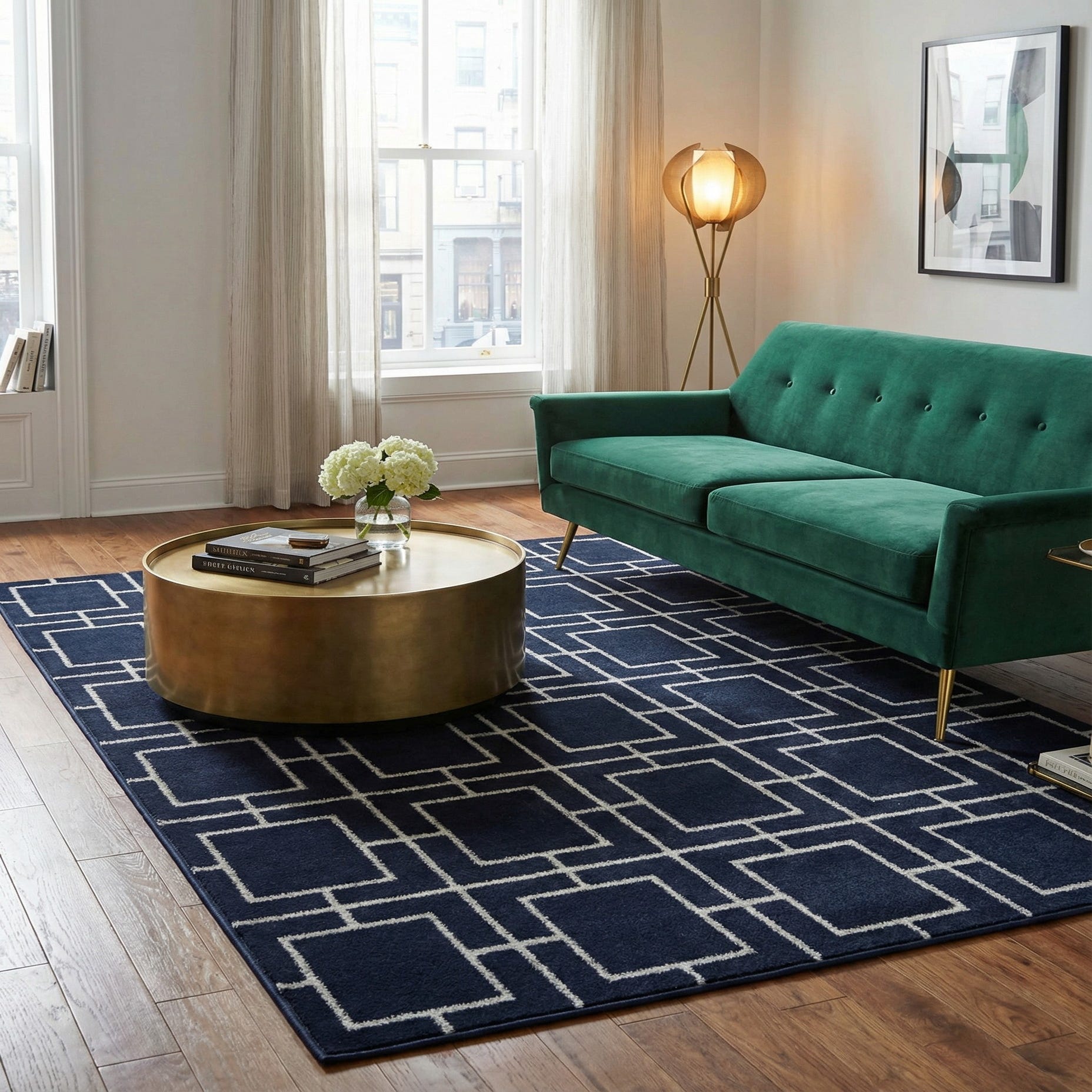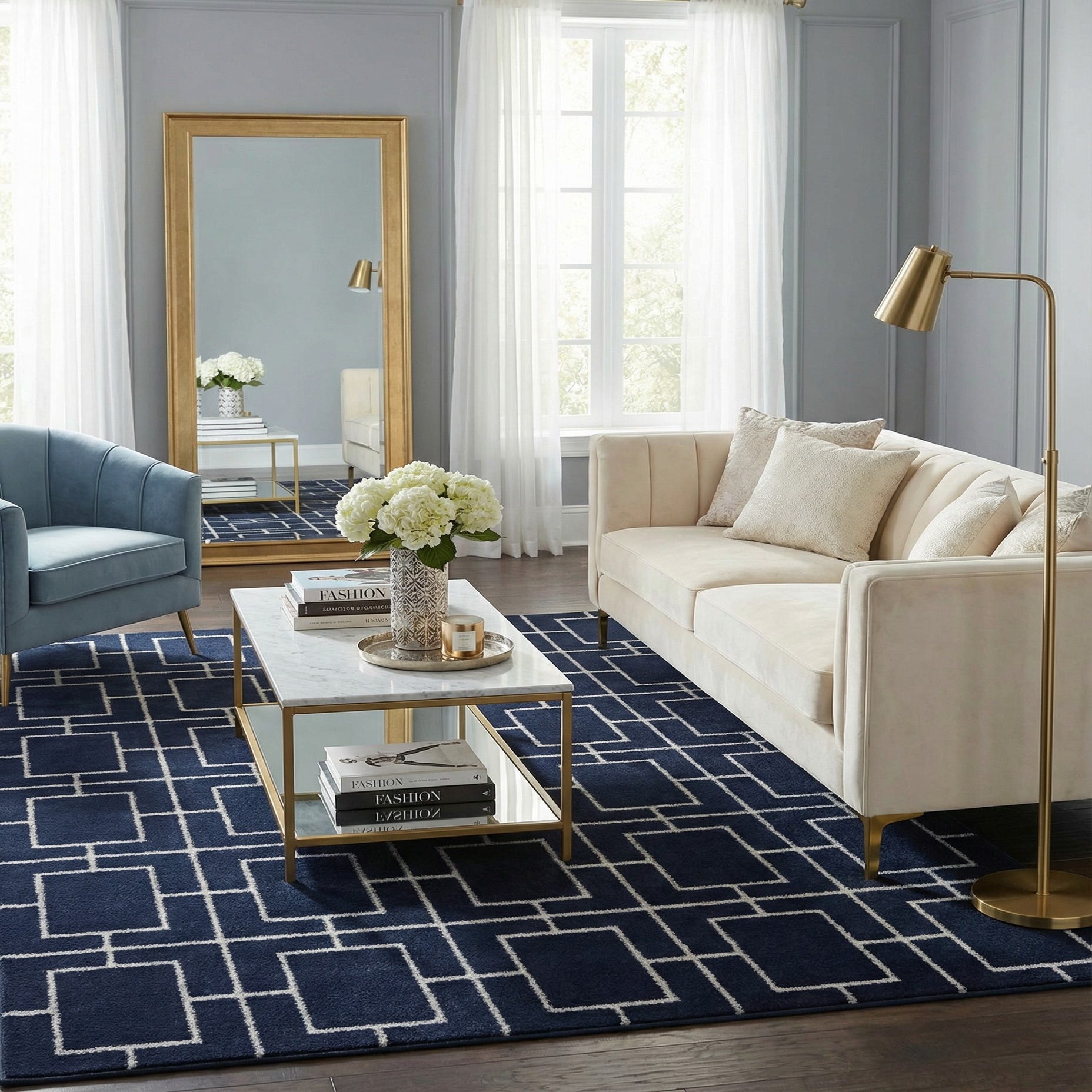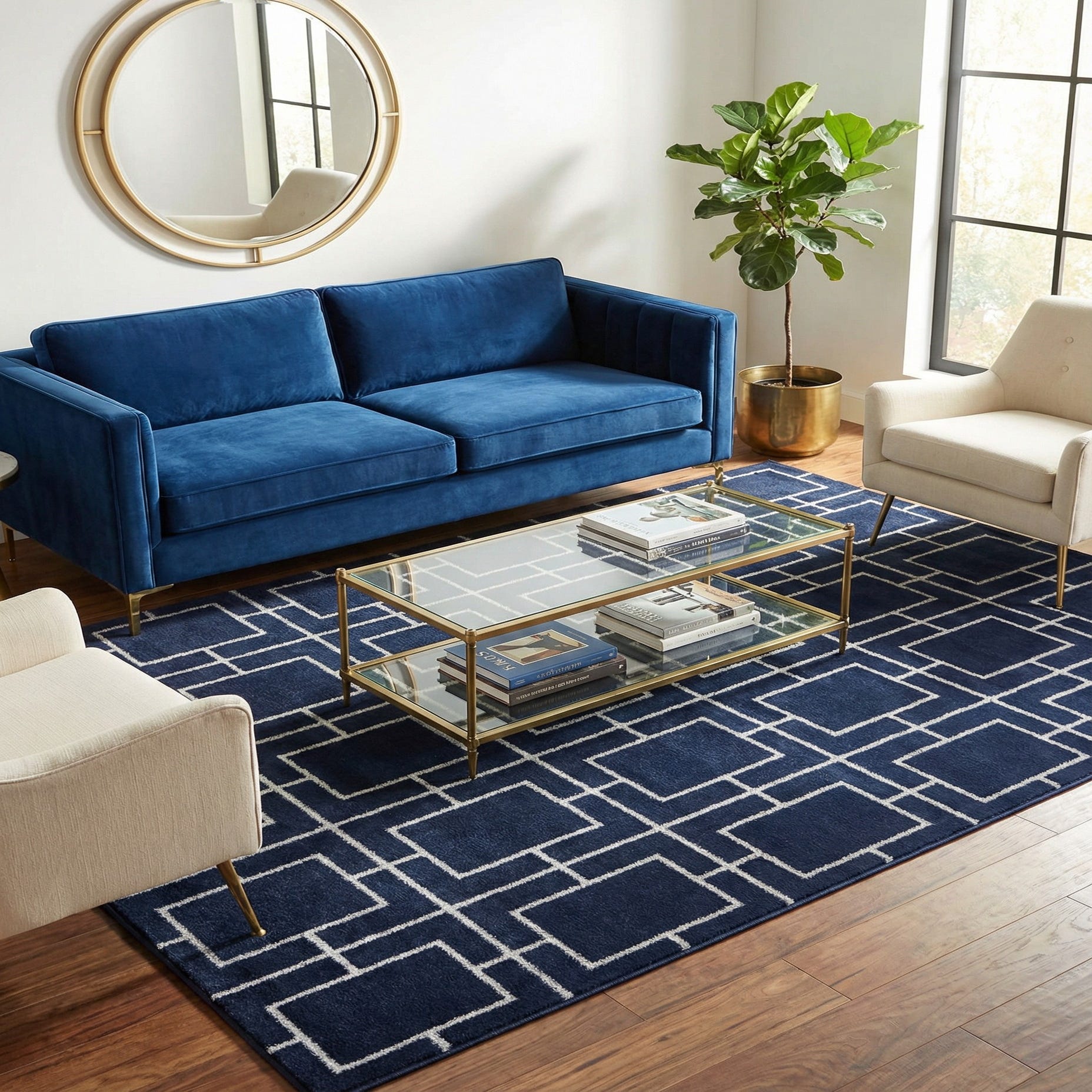 Machine made from 70% polypropylene and 30% polyester, this rug offers a tactile, low-profile pile that works well as an anchor in smaller seating areas, a bedroom, or a home office. Pair it with mid-century or contemporary furniture and metal accents to emphasize the glam geometry, or layer it over light hardwoods to let the Navy Blue Silver ground deepen a neutral palette. It also complements mirrored or chrome finishes and pairs nicely with textured throws and cushions in soft grays or navy for a cohesive, polished interior.