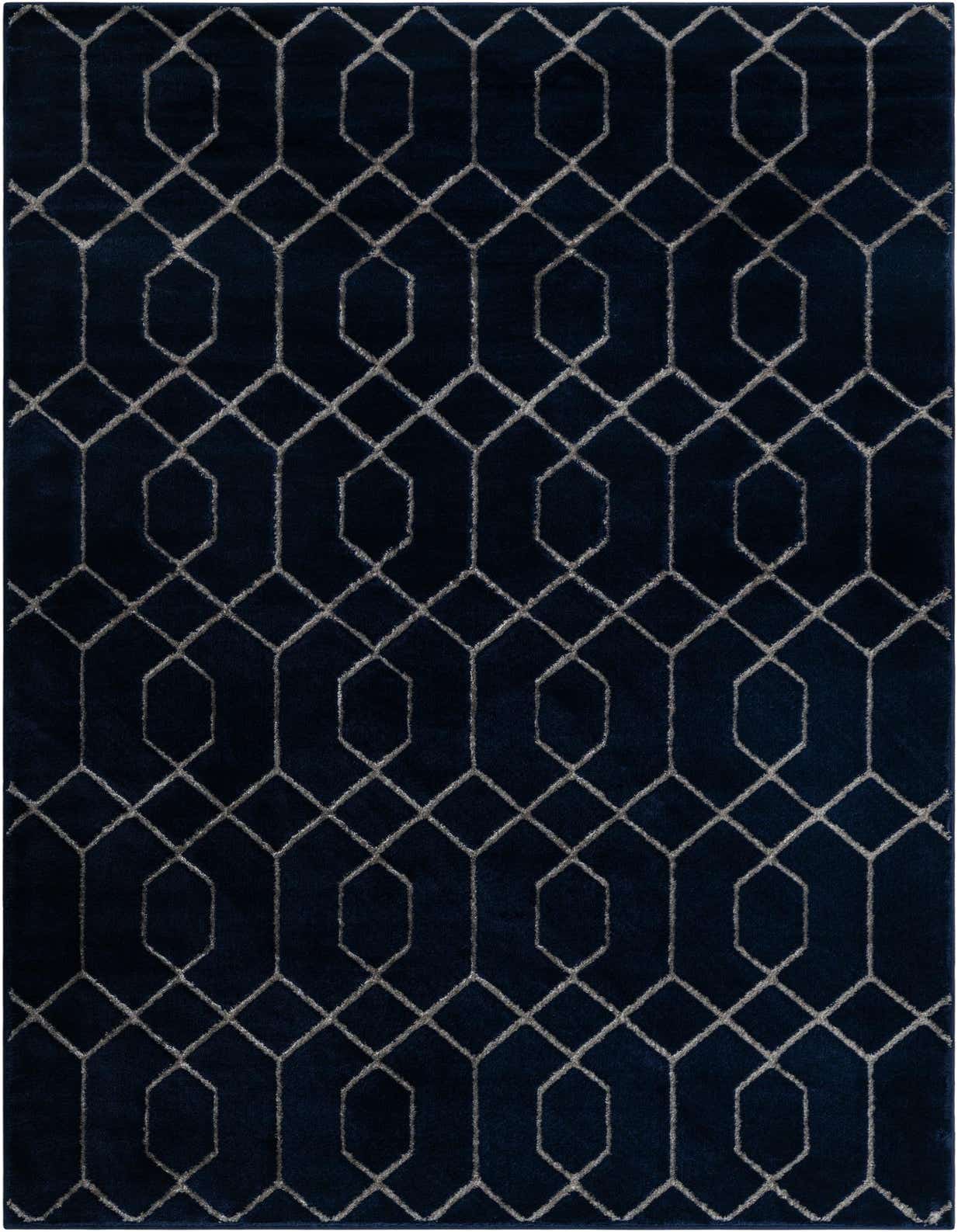 A 5x8 rectangular navy blue area rug with a textured silver trellis pattern, suitable for a living room.