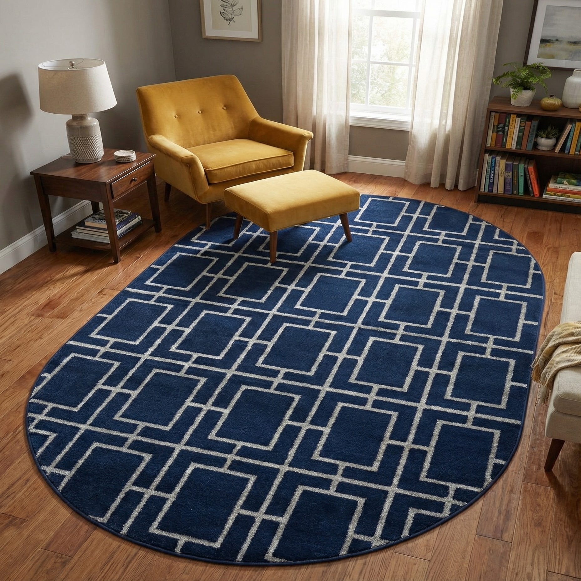 A bold geometric trellis of silver rectangles sits on a Navy Blue Silver background, creating a refined, architectural motif that feels modern and composed. Machine made from 70% polypropylene and 30% polyester, the rug’s navy field has a soft, velvety hand while the silver trellis has a slightly firmer, low-profile pile with a subtle sheen that catches light and adds depth. The oval shape softens the strong lines of the pattern, offering a balanced look that’s both structured and approachable.