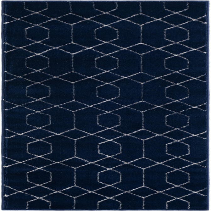 A crisply drawn trellis pattern of interlocking elongated hexagons and diamonds is rendered in silver yarn against a Navy Blue Silver background, giving the design a modern, geometric character with a hint of soft shimmer. Machine made from 70% polypropylene and 30% polyester, the rug’s dense, low-pile surface feels smooth and slightly cushioned underfoot while maintaining a clean, tailored appearance. The silver pattern contrasts cleanly with the deep background, creating visual depth without overwhelming the space.