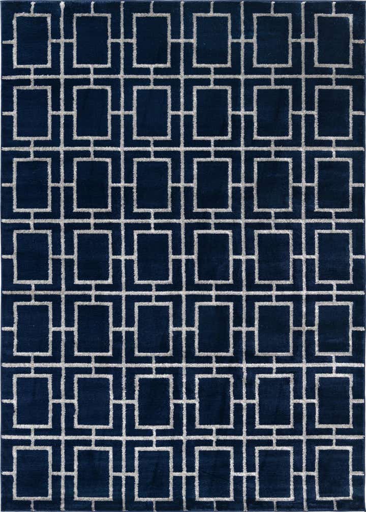 A graphic trellis of interlocking rectangles creates a strong, modern silhouette across a deep Navy Blue Silver ground, with clean Silver lines forming repeating rectangular motifs. The geometric pattern gives the rug a structured, rhythmic look that balances bold contrast with tailored restraint. The background color is Navy Blue Silver, complemented by Silver accents that bring clarity and definition to the design.