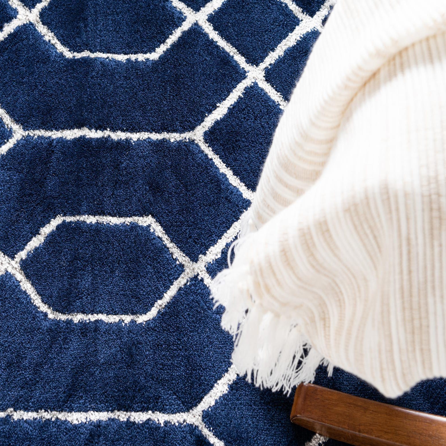 A deep navy blue-silver ground sets a cool, refined backdrop for a repeating silver trellis motif of elongated octagons and interlocking diamonds. The geometric pattern reads clean and contemporary, with crisp, even lines that create rhythm across the surface. Machine made from 70% polypropylene and 30% polyester, the rug has a soft, low-to-medium pile with a velvety hand and a subtle sheen; the silver pattern sits slightly raised, adding a touch of tactile texture underfoot.