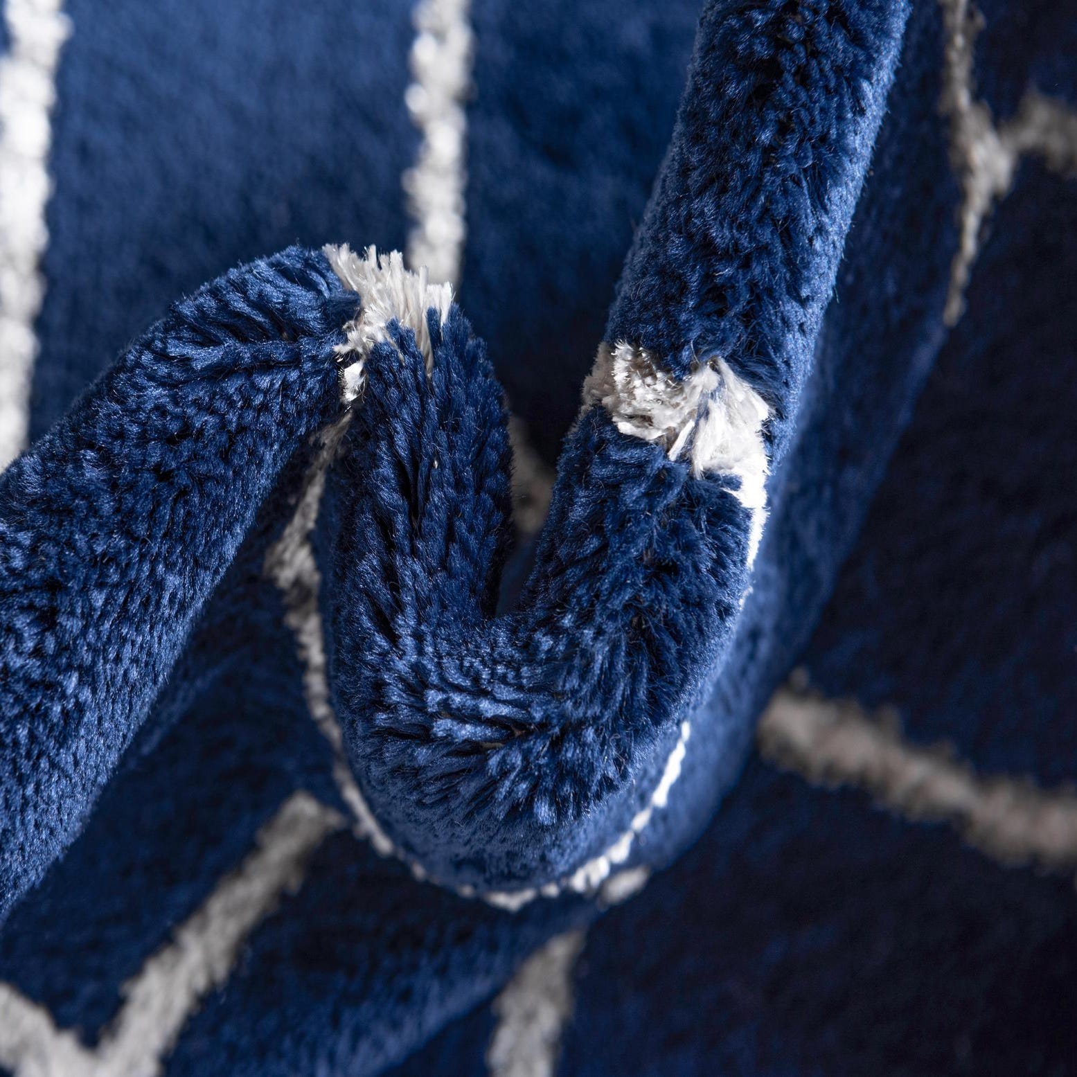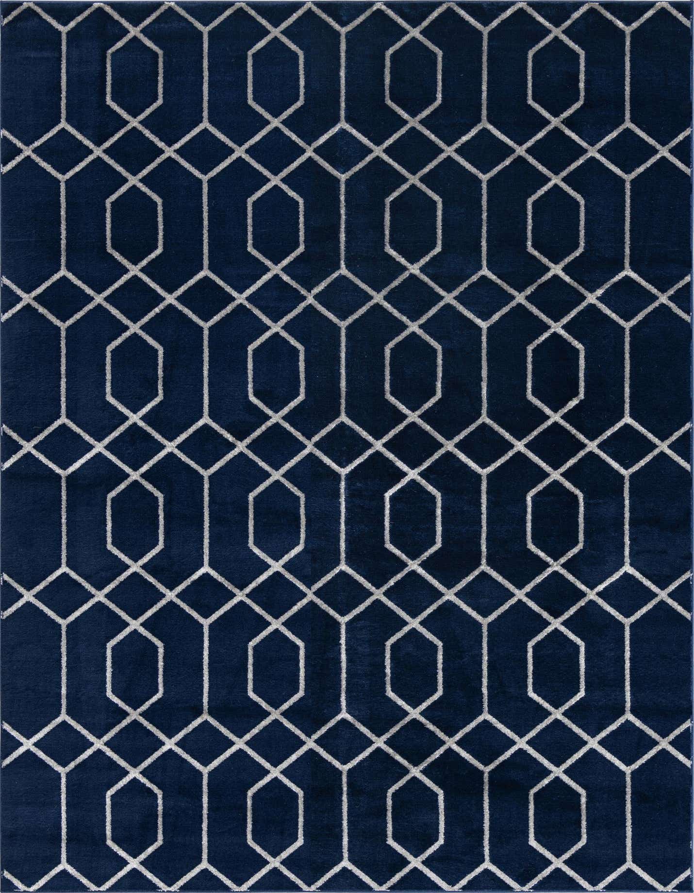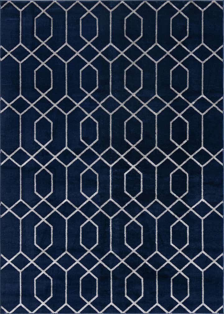 A 7x10 rectangular Marilyn Monroe Glam Trellis rug in deep blue with a repeating silver geometric trellis pattern.