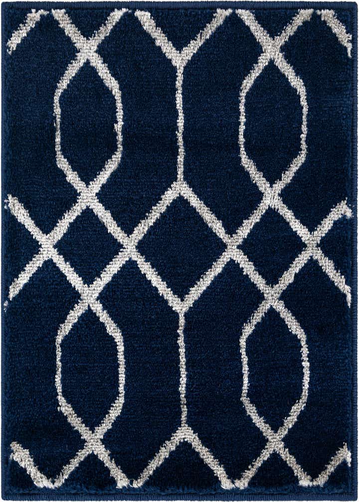 A close-up of a blue rectangular rug sample with a raised, textured white Hollywood Glam trellis pattern.