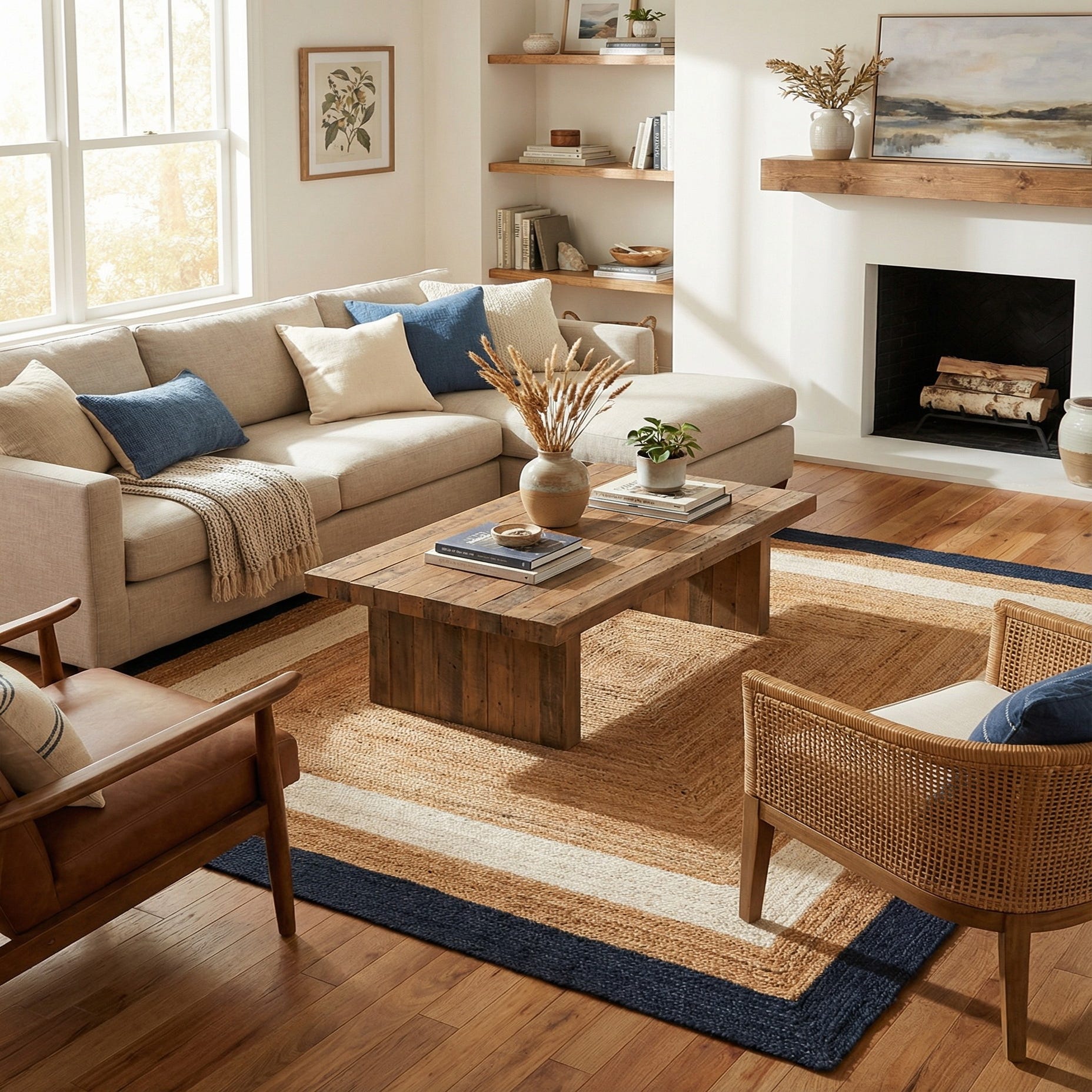 A square 7' 10 x 7' 10 natural jute rug with concentric squares in tan, cream, and a dark blue border.