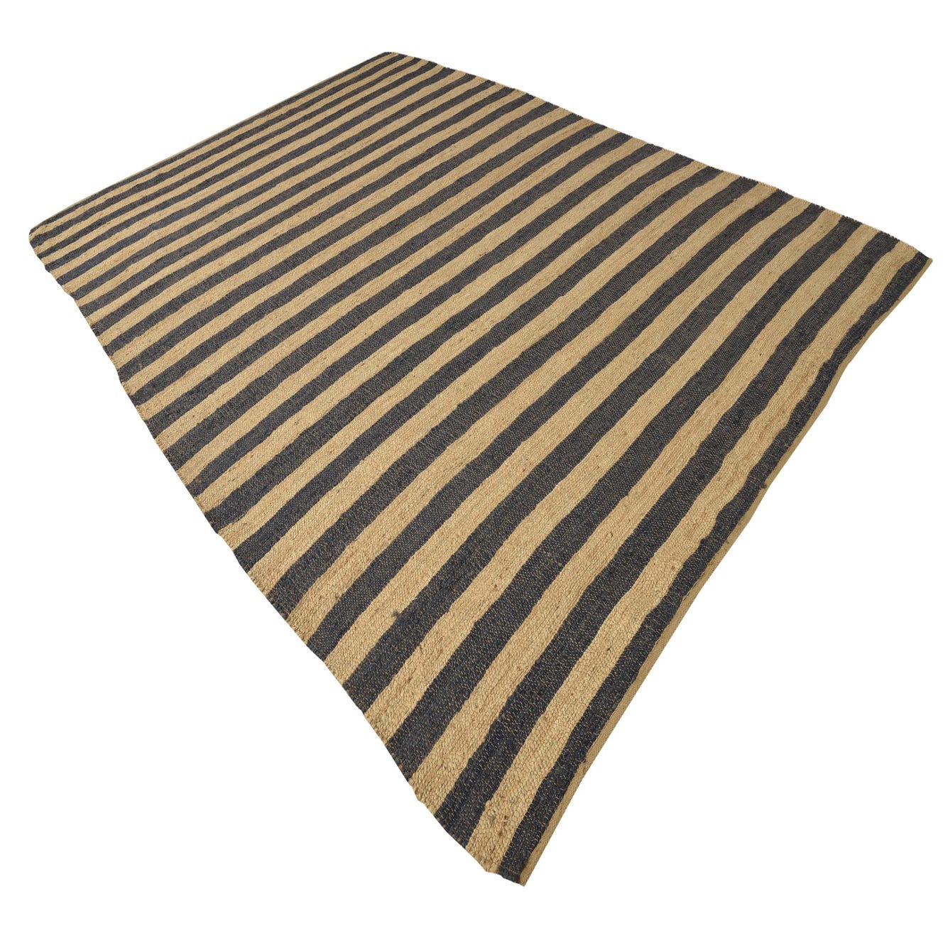 Hand-braided from 100% jute, this rug presents a clean, horizontal stripe pattern in navy and ivory. The alternating bands are slightly irregular, a result of the braided construction that gives each stripe subtle depth and character. Underfoot the rug has a tactile, natural texture—firm with a gentle roughness typical of jute fibers—and the braided rows catch light in ways that highlight the material’s organic weave.