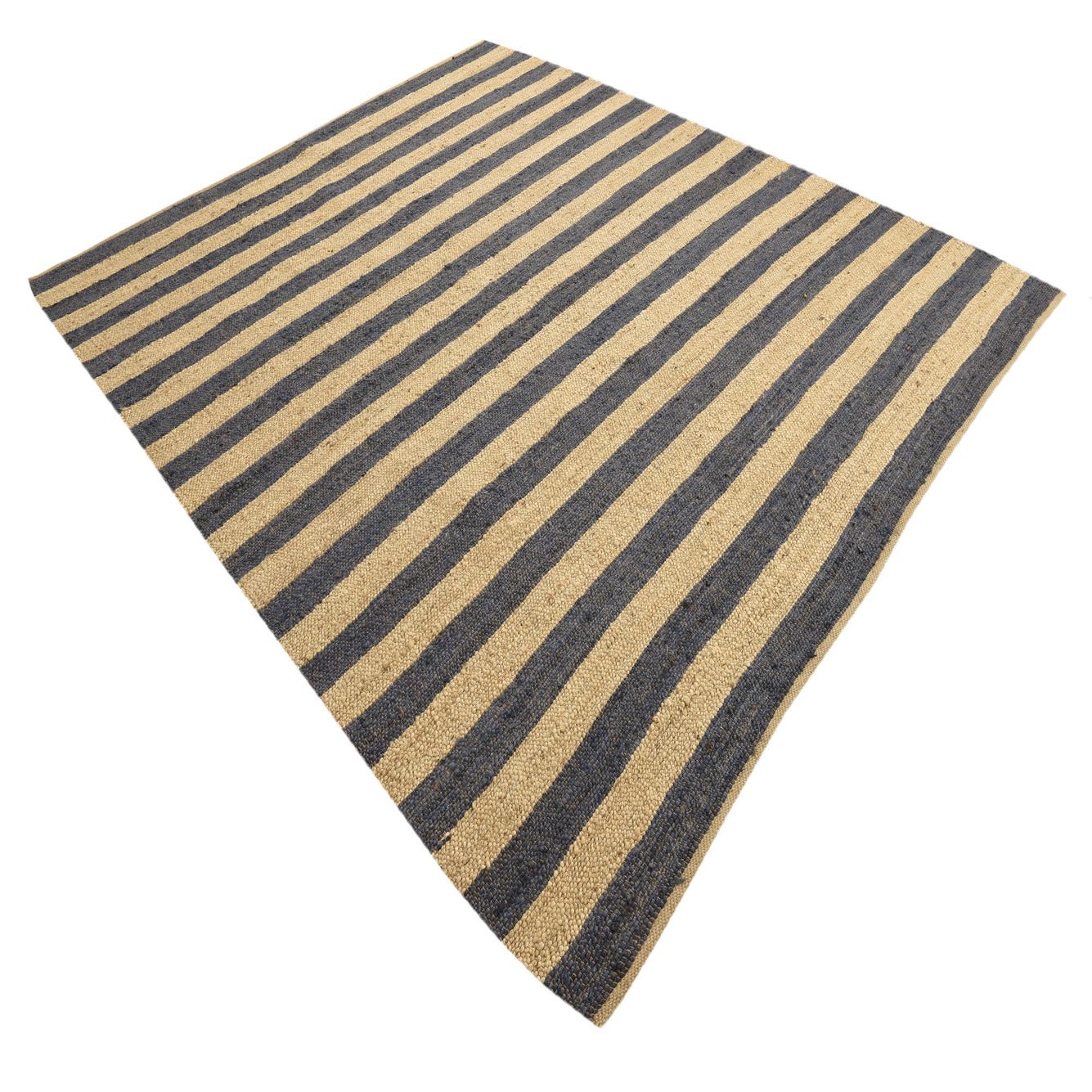 Hand-braided of 100% jute, this rug presents clean, horizontal navy and ivory stripes woven into a low-profile, flat surface. The braided construction creates subtle, tactile ridges that you can feel underfoot and small, handcrafted variations that add visual interest without distracting from the simple, linear pattern. The navy bands are a deep, steady tone set against warm ivory that highlights the natural fiber’s texture.