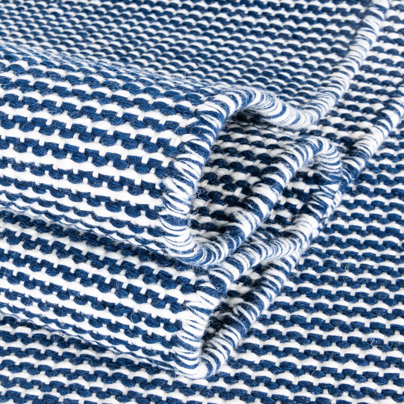 A tightly woven flatweave in Navy Sky with fine Ivory threading creates a subtle, linear pattern that reads as a clean, modern field of color. The background Navy Sky grounds the look while the Ivory weave lifts it with delicate, horizontal texture—close-knit lines and tiny slubs give the surface a tactile, almost linen-like feel. The rug's low-profile hand is firm underfoot, with a crisp edge and understated fringe that keep the silhouette neat and composed.