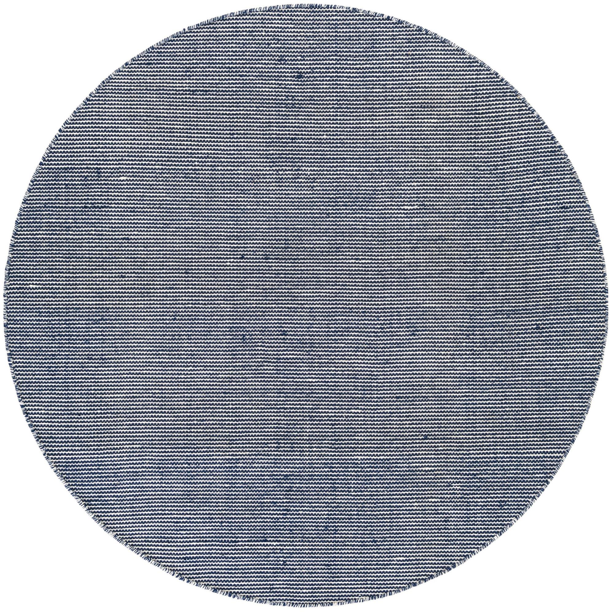 A refined, low-profile flatweave in Navy Sky with fine Ivory banding, this round outdoor rug presents a tight, horizontal stripe pattern that reads clean and contemporary. Run your hand across the surface and you'll notice a slightly textured, tightly woven face that lies flat underfoot—subtle variation in the weave gives the pattern depth without bulk. The Navy Sky background provides a strong, grounding field while the thin Ivory stripes add visual interest and a crisp contrast.
