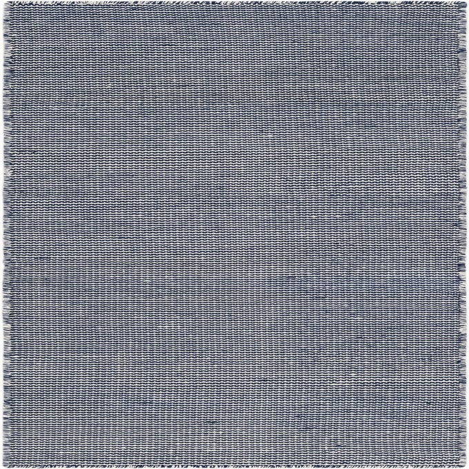 Set on a Navy Sky background, narrow Ivory rows form a small-scale, horizontal stripe with a subtle wavy motif. The hand made flatweave construction in 100% PET Polyester (Recycled Plastic Bottles) creates a low-profile, slightly ribbed texture that feels firm underfoot while keeping a clean, tailored appearance. Short ivory fringe on the ends adds a relaxed finishing touch, and the tight weave keeps the navy and ivory contrast crisp and consistent across the surface.