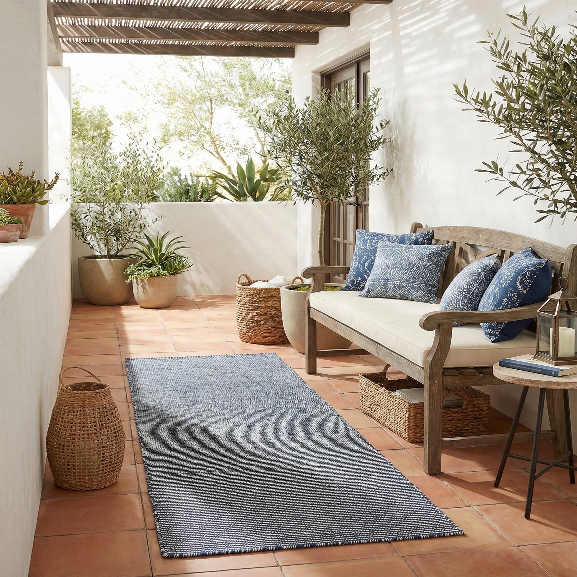 Navy Sky 8 Ft Runner rug with a textured, modern flatweave pattern, suitable for indoor/outdoor use.
