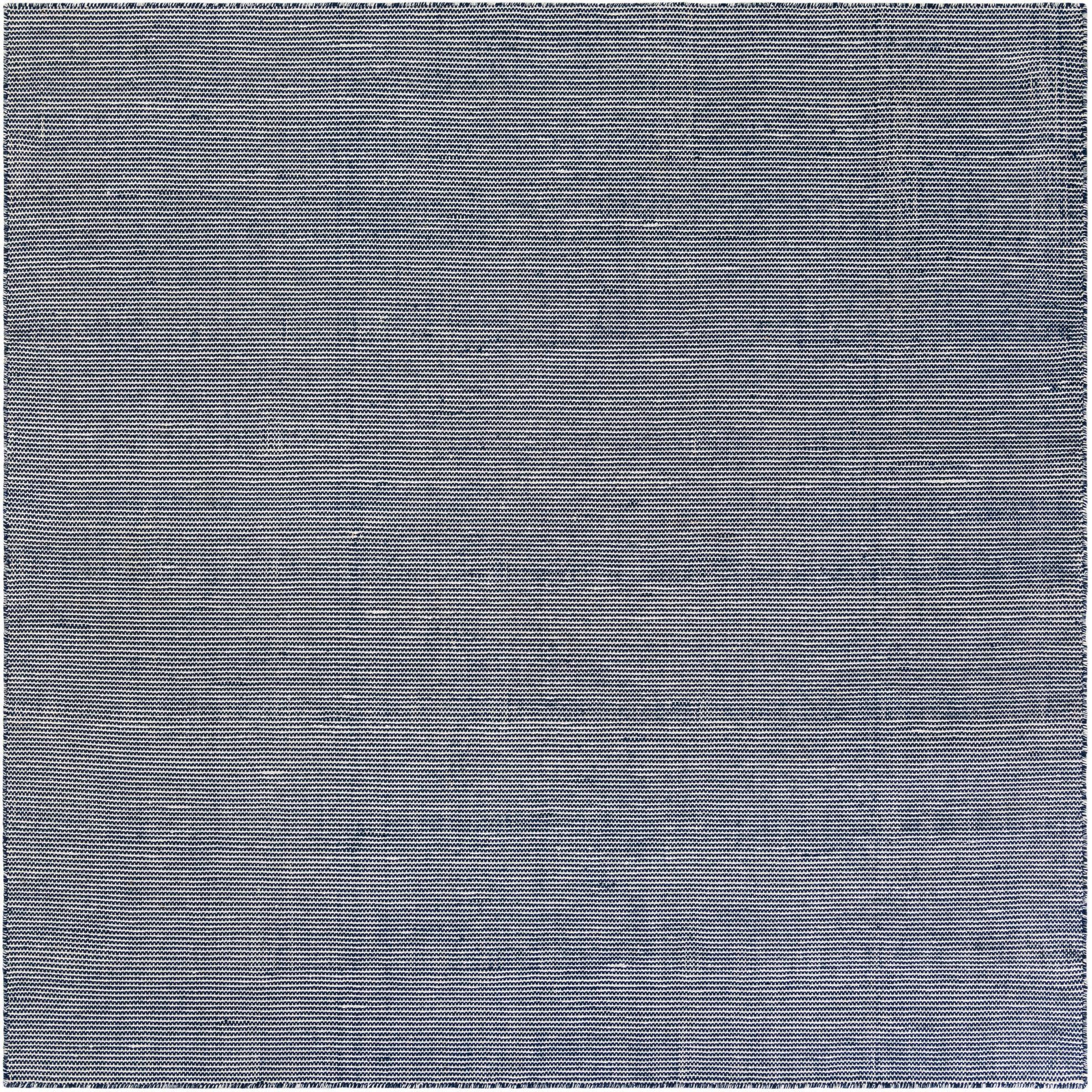 A deep Navy Sky field anchors this rug while a tight, small-scale ivory geometric weave creates subtle horizontal patterning across the surface. The hand-made flatweave in 100% PET polyester (recycled plastic bottles) gives the piece a low-profile, slightly firm hand with a hint of textured grain underfoot—clean, tailored, and quietly graphic in appearance.