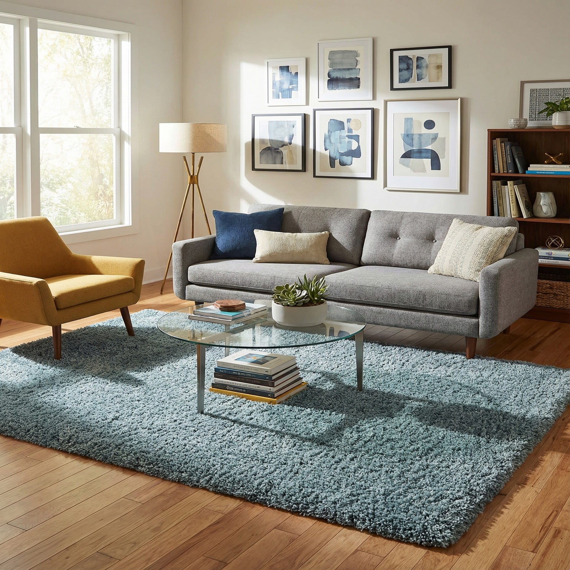 Machine made from 100% polyester, the dense shag feels springy underfoot and invites bare feet or cozy lounging. Its modern shag style pairs naturally with mid-century pieces, coastal-inspired rooms, or contemporary living spaces; try it beneath a low-profile sofa and coffee table for a relaxed living room, at the foot of a bed to add warmth and texture, or layered under a reading nook chair to soften a hard floor.