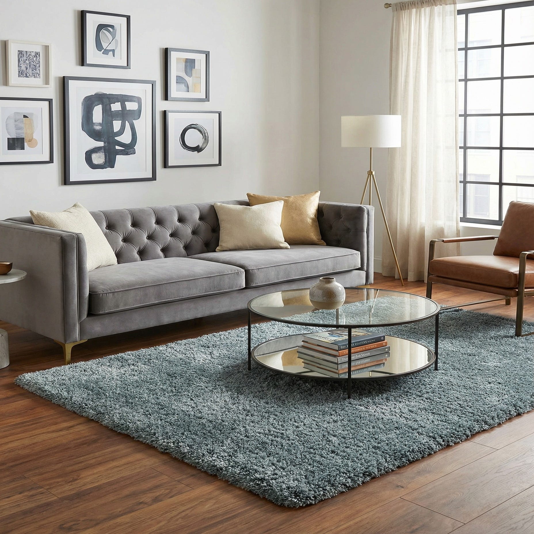 Plush, high-pile shag in a cool Niagara background creates a calm, tonal surface with gentle depth. The rug is essentially solid in pattern, with subtle variations in shade produced by the pile’s direction and density rather than printed motifs. That soft, uniform field makes it easy to anchor a seating area or add a quiet color note to a bedroom without competing with patterned furnishings.
