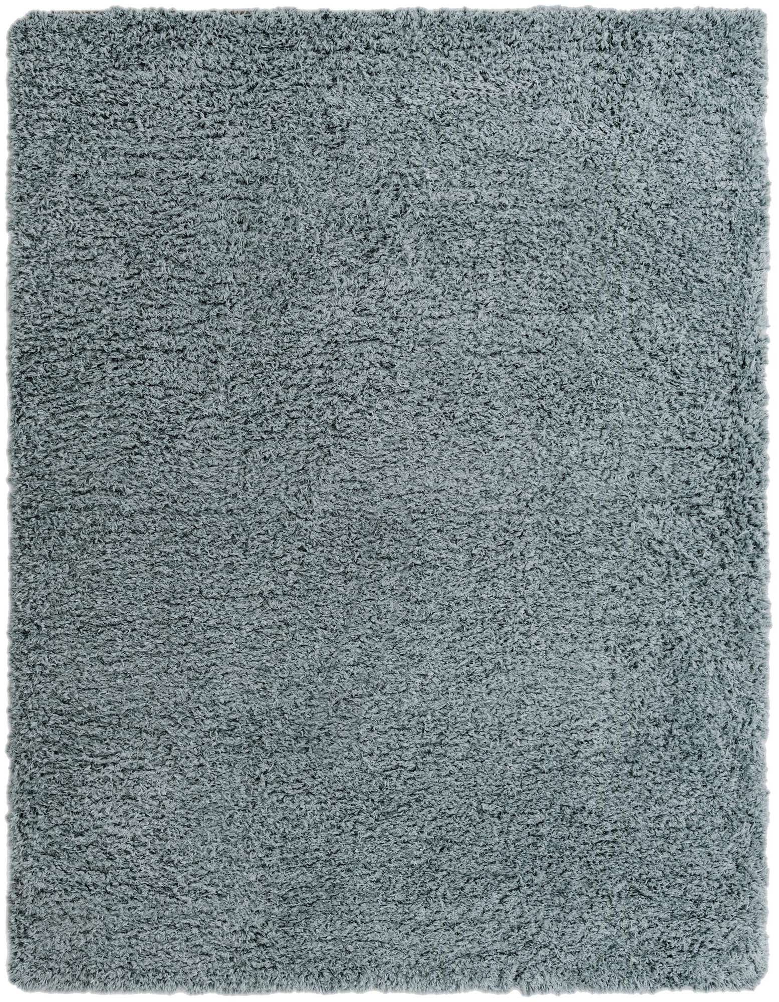 This plush shag rug presents a solid field in Niagara, a muted blue-green with soft gray undertones that brings a calm, modern presence to a room. The high-pile construction creates gentle tonal shifts across the surface, giving the rug quiet depth without a defined pattern. Its overall style is contemporary casual—clean and unfussy, offering visual warmth through texture rather than elaborate design.