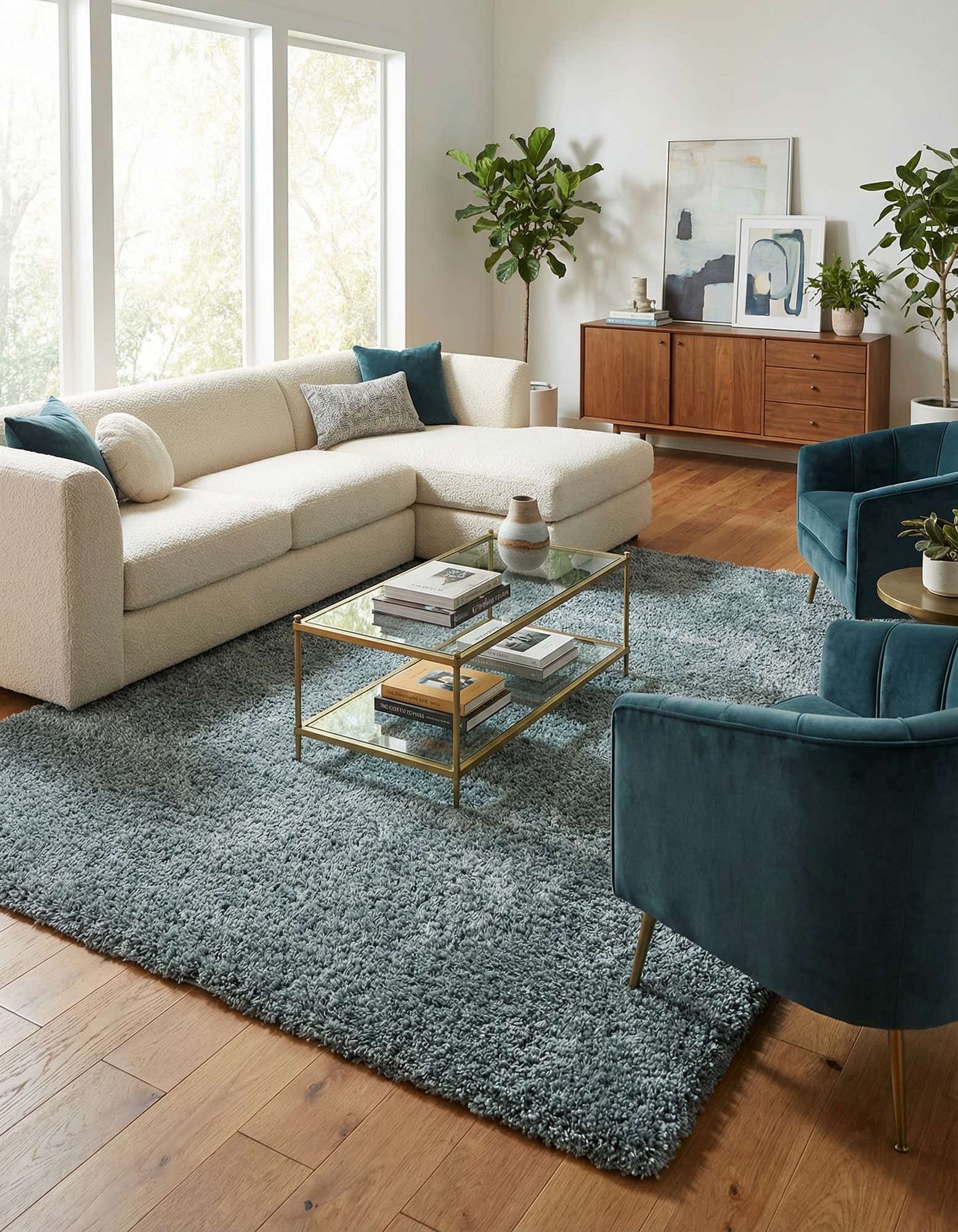 A soft, plush 9x12 rectangular blue shag area rug, ideal for adding comfort and modern style to a living room.