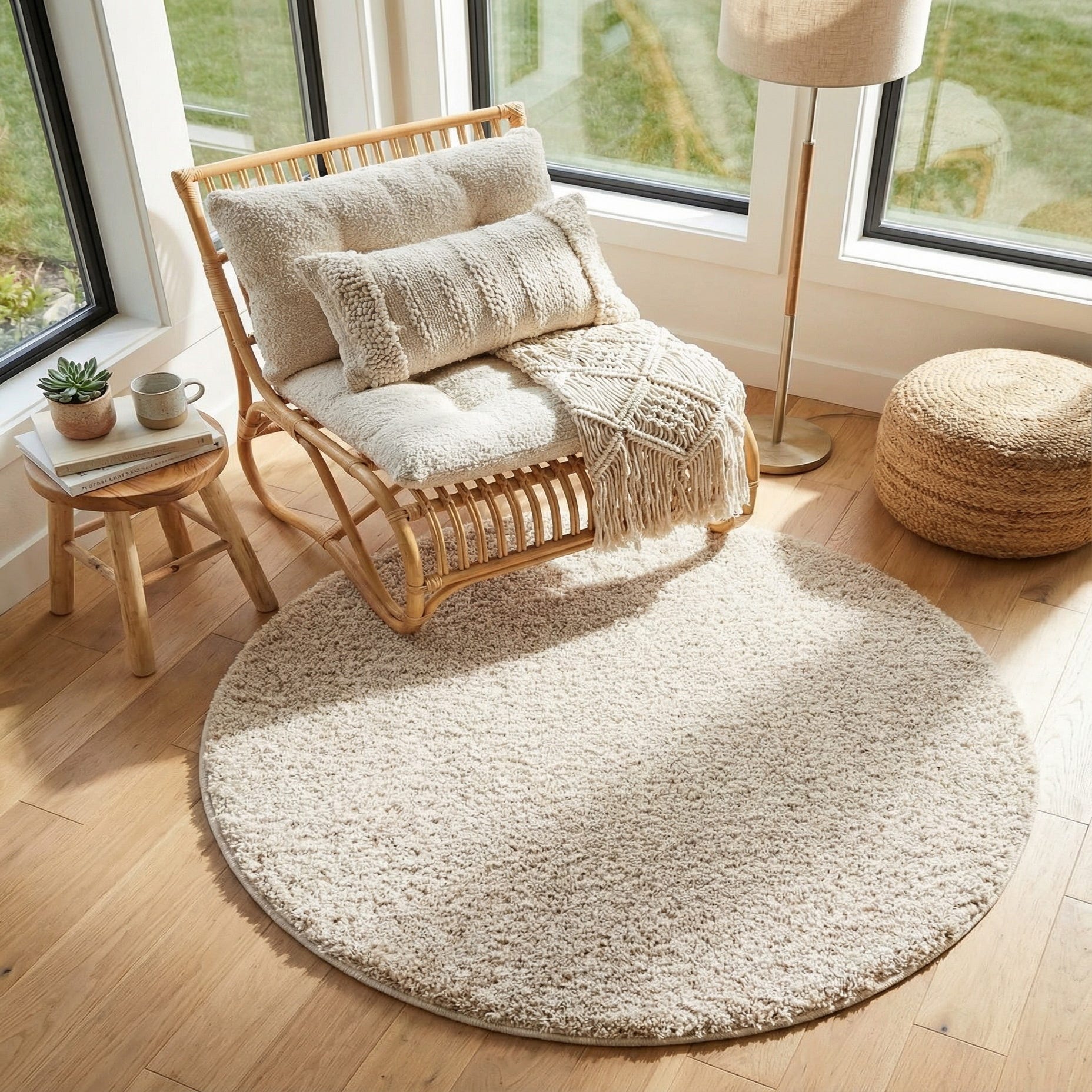 A round, solid shag in Oatmeal Beige, this rug offers a consistent, quietly textured surface that invites you to step down and stay a moment. The long, plush pile creates a soft, pillowy feel underfoot and a subtle, natural depth across the face of the rug. The uniform color and lack of pattern give a calm, minimal look that complements a variety of furnishings while adding a tactile layer to the floor.