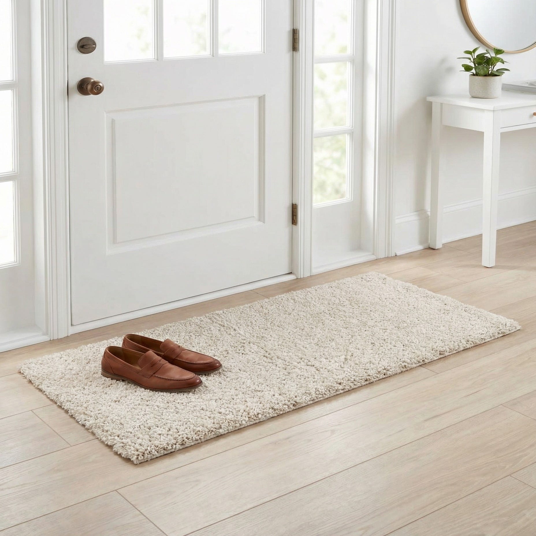 A plush, deep-shag runner in a warm oatmeal beige creates a soft, uniform field of texture that invites bare feet. The pile is densely tufted with long polypropylene fibers, giving the surface a cushioned feel and a subtle, consistent nap. The solid color keeps the look clean and calm, while the tactile density adds visual interest up close without a competing pattern.