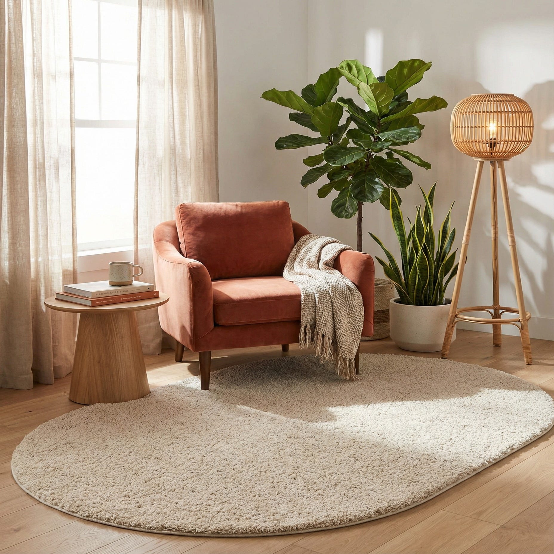 The oval silhouette softens corners and balances angular furniture, making it a natural choice for a cozy seating area, a bedside landing, or a nursery. It layers well over hardwood or tile and pairs nicely with Scandinavian, coastal, contemporary, or modern farmhouse decor, especially when used to anchor a small conversation grouping or a round bistro table.