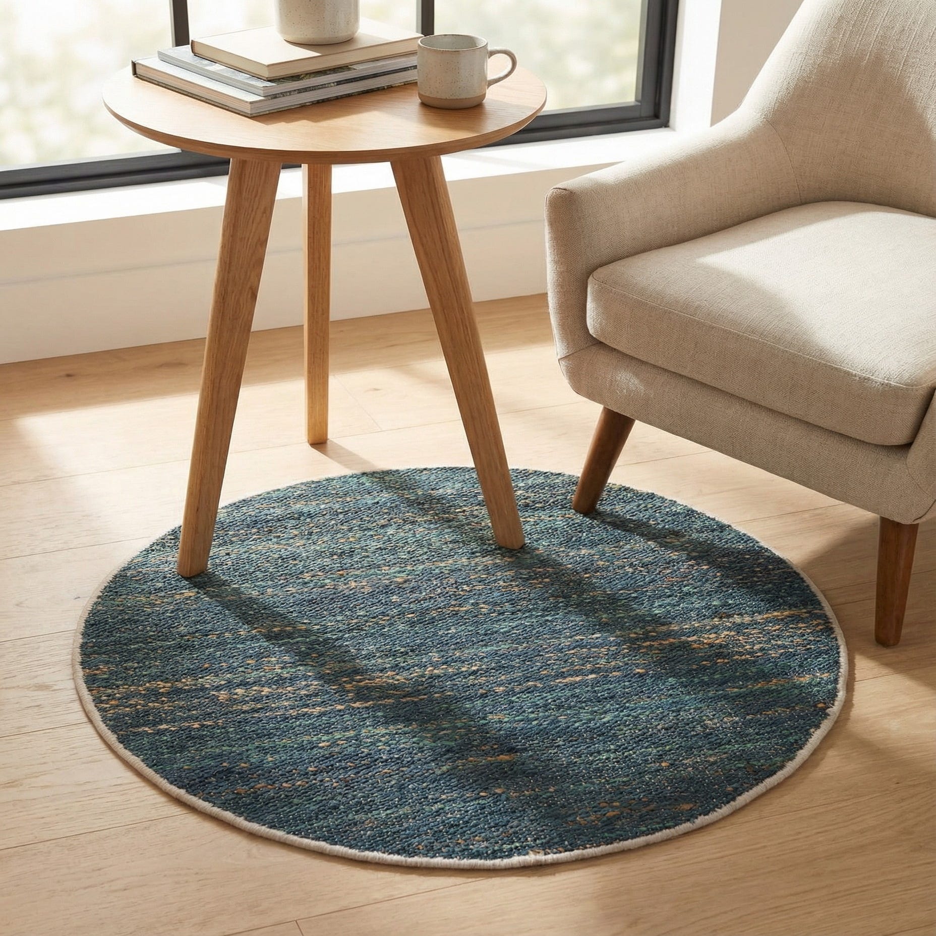 Ocean Blue forms the base of this hand-woven round rug, interlaced with flecks of natural tan and muted green that create a soft, linear striation across the surface. Hand woven of 80% jute, 10% wool and 10% cotton, the construction yields a low-profile, braided texture that feels slightly nubby underfoot while still offering a gentle, cushioned give from the wool and cotton threads. The subtle banding and mixed-fiber weave give the rug an organic, lived-in look that pairs well with natural materials.