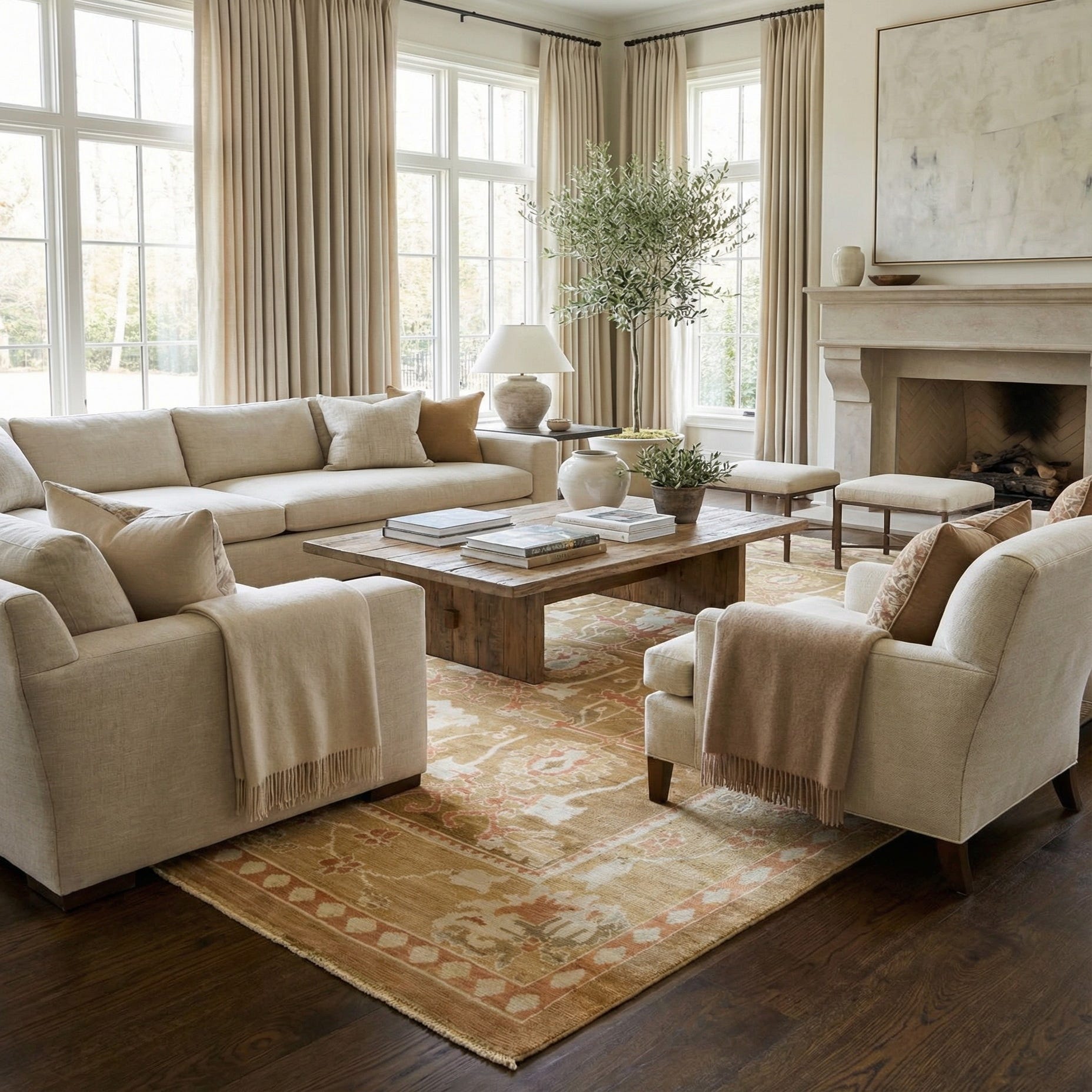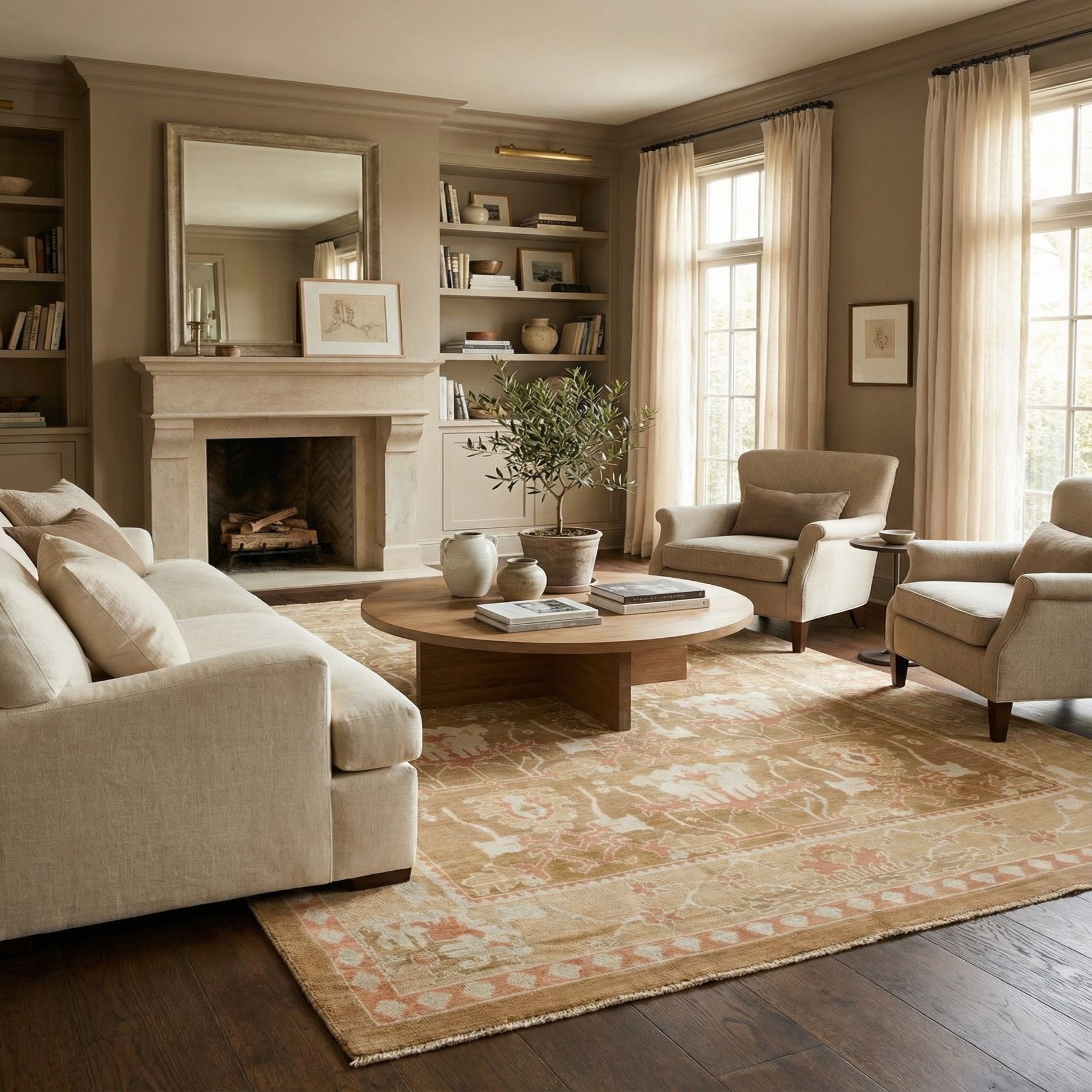 This rug anchors large seating groups and dining areas, where its scale and warm olive backdrop help unify wood tones and neutral upholstery. It complements transitional and traditional interiors as well as relaxed contemporary schemes—think linen sofas, brass or aged-metal accents, and woven textures. Use it to ground a living room arrangement, place it beneath a sizable dining table, or layer it under a bedroom set to add warmth and quiet pattern to the space.