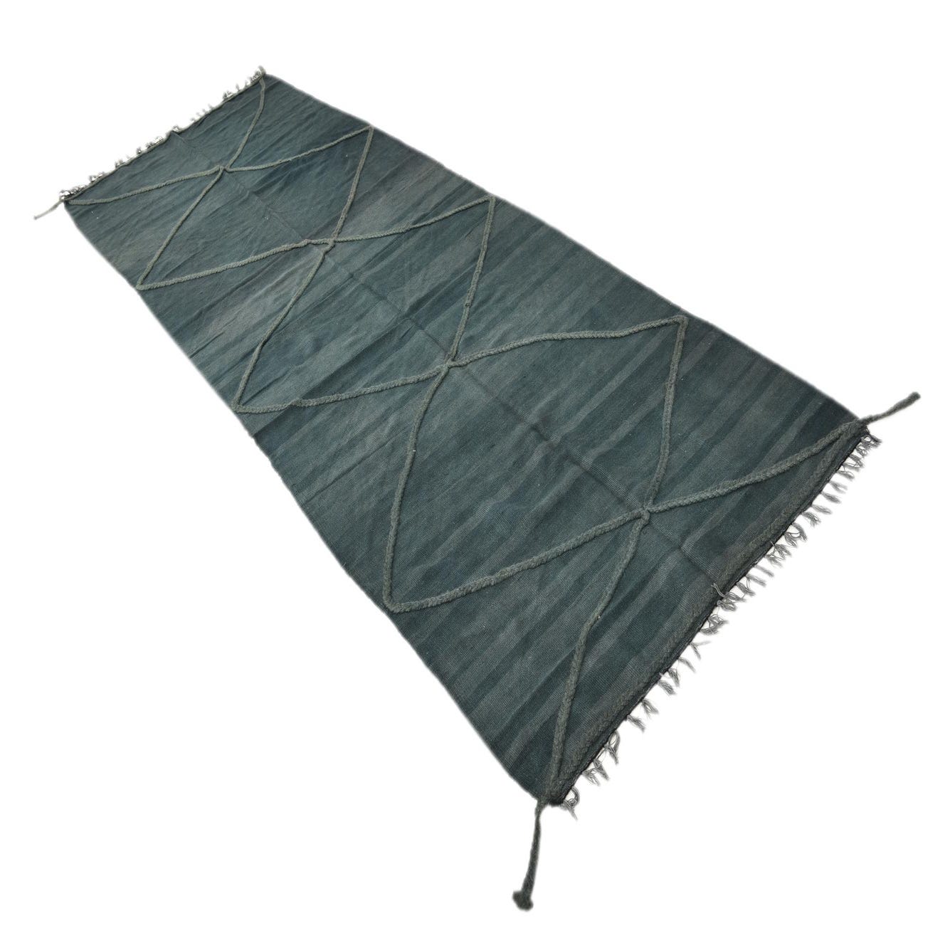A long, narrow 11 ft green runner rug with horizontal stripes and a raised diamond pattern, ideal for a hallway.