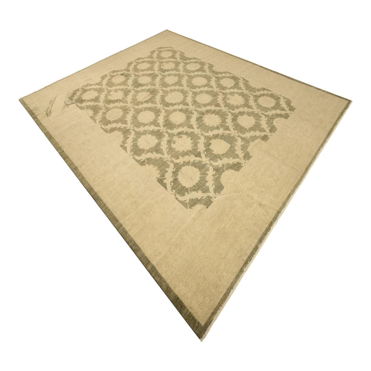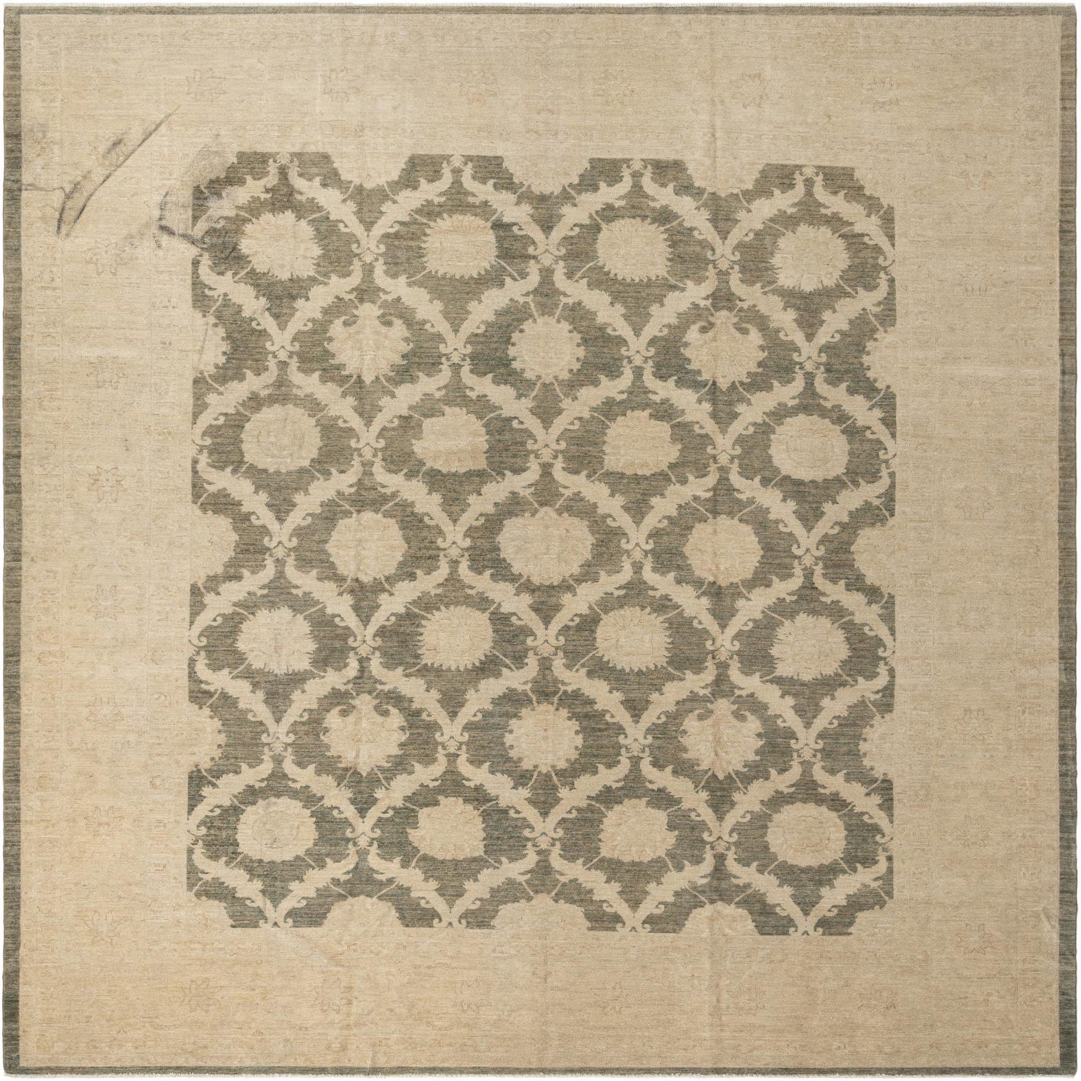 The Peshawar Ziegler rug is a 12x15 hand-knotted carpet that brings a sophisticated balance of design and comfort to any large space. The hand-spun wool construction affords it a texture that is soft to the touch, adding a sense of warmth to its aesthetic. The pattern features traditional motifs arranged in a symmetrical layout, with a central medallion design and ornamental floral elements throughout. The palette of olive, beige, cream, and light brown tones creates a harmonious and versatile color scheme that easily complements a variety of decors, while the olive background provides a subtle, earthy anchor for the design.