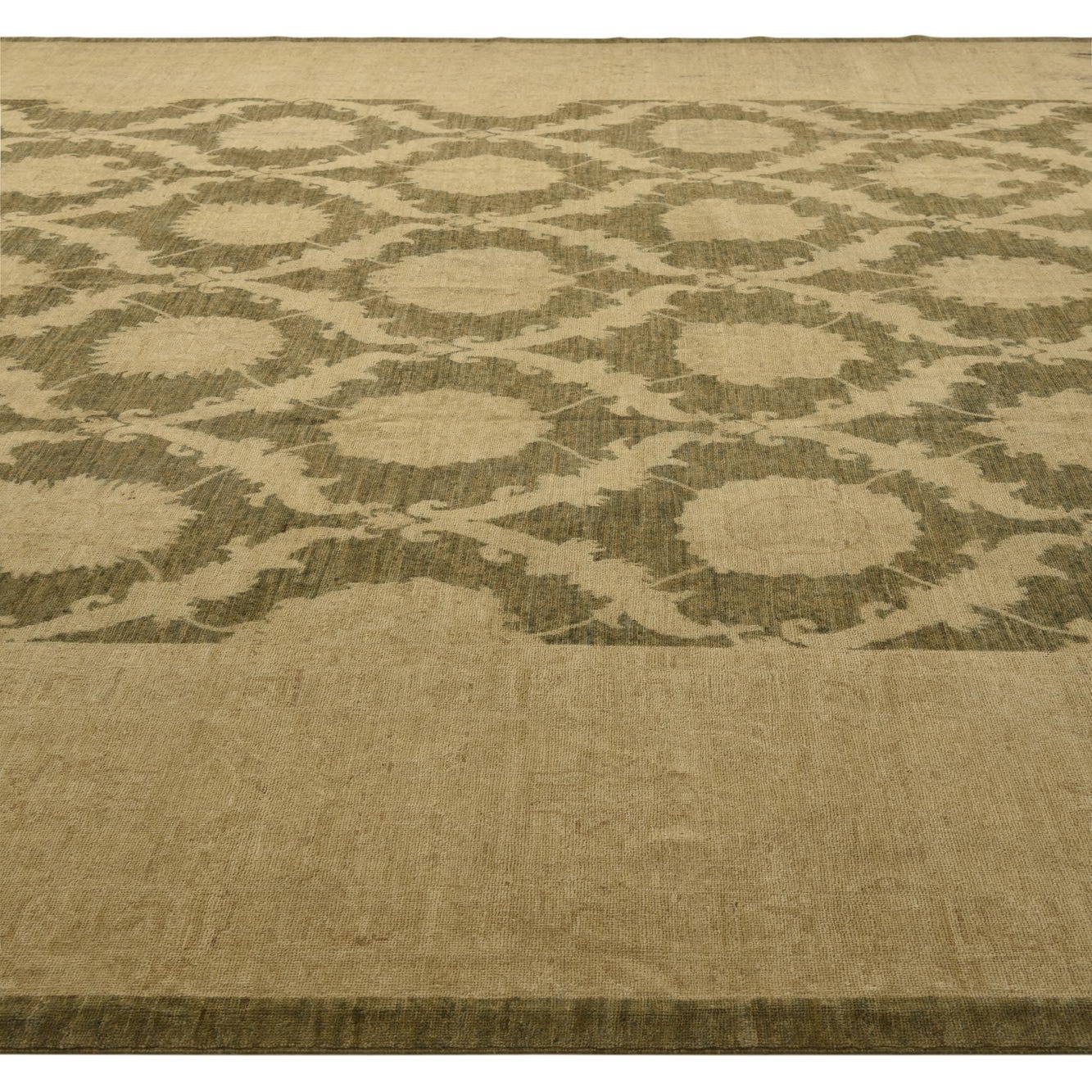 A large 12x15 rectangular green and beige traditional rug with a central botanical medallion pattern and a subtle border.