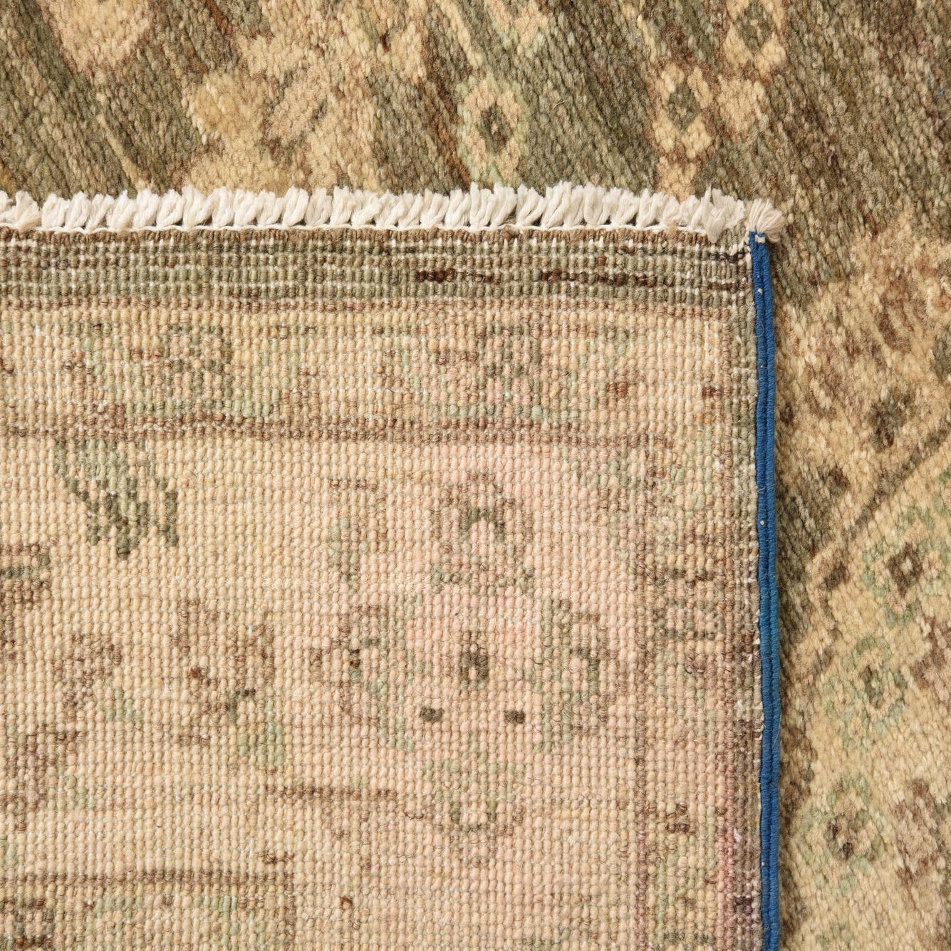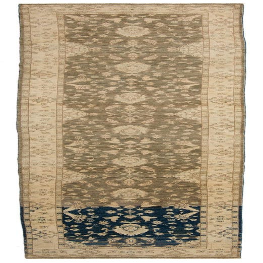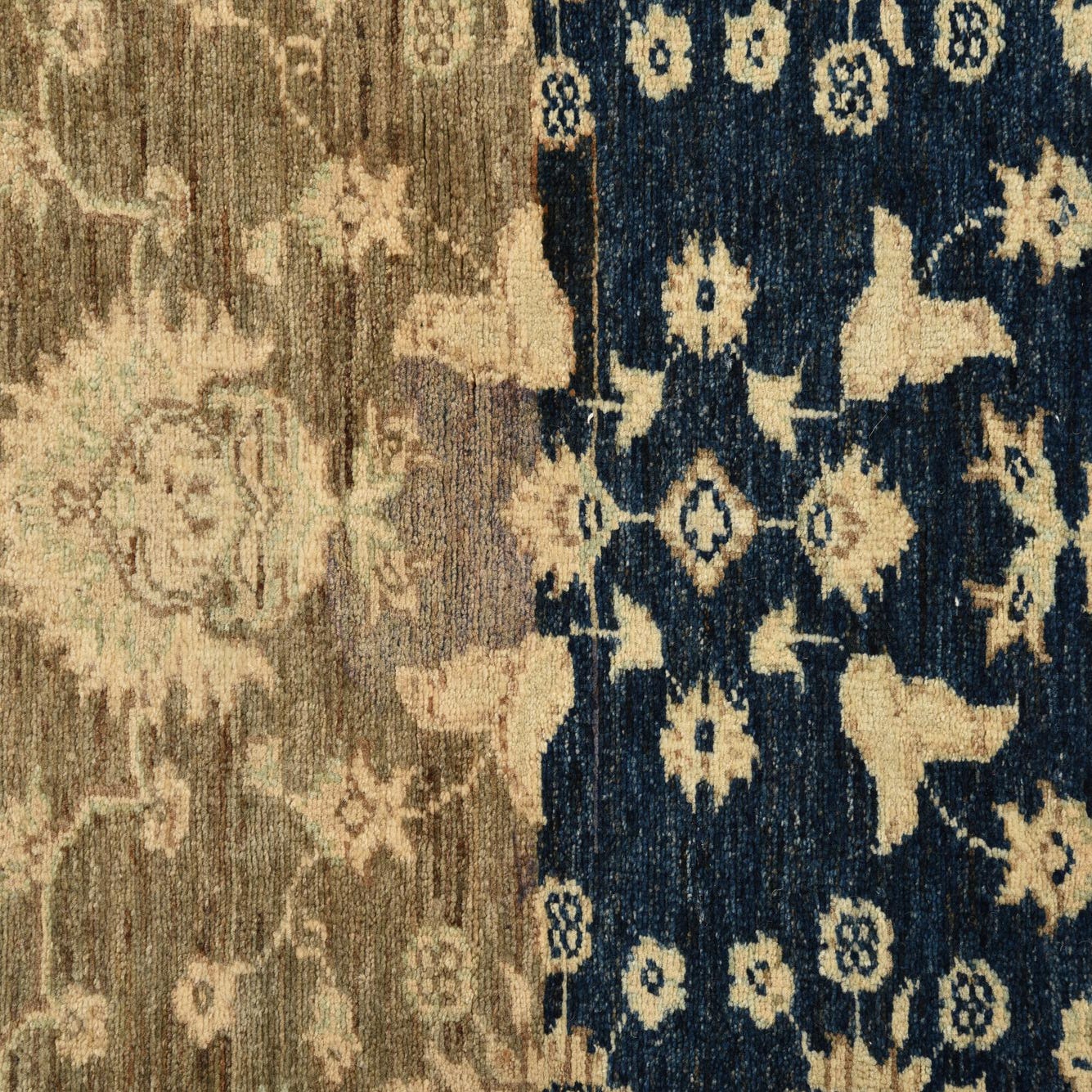 Primary color is Olive. Colors in this rug include: Olive, Ivory, Navy Blue, Gray.