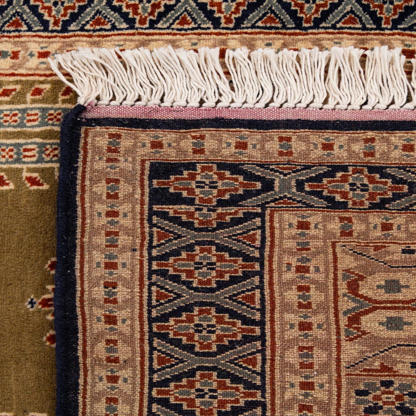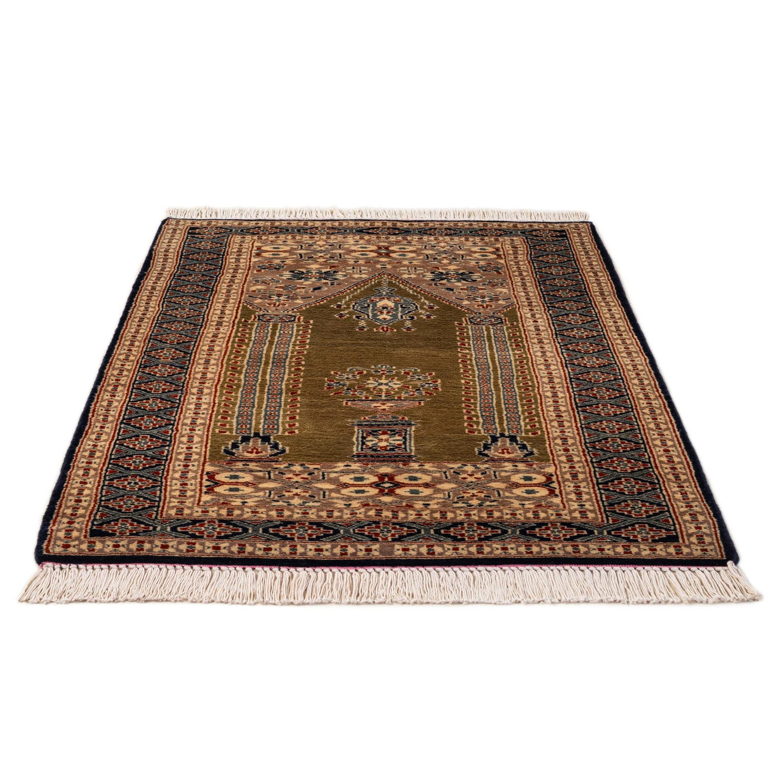 Primary color is Olive. Colors in this rug include: Olive, Beige, Cream, Navy Blue, Burgundy.