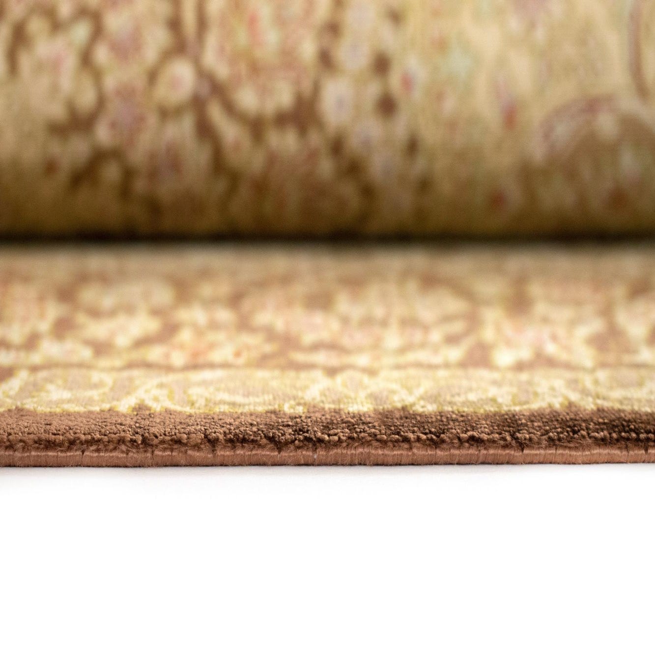 A rectangular 3x4 Ghom Silk Persian rug in shades of green and brown with intricate floral patterns and a central medallion.