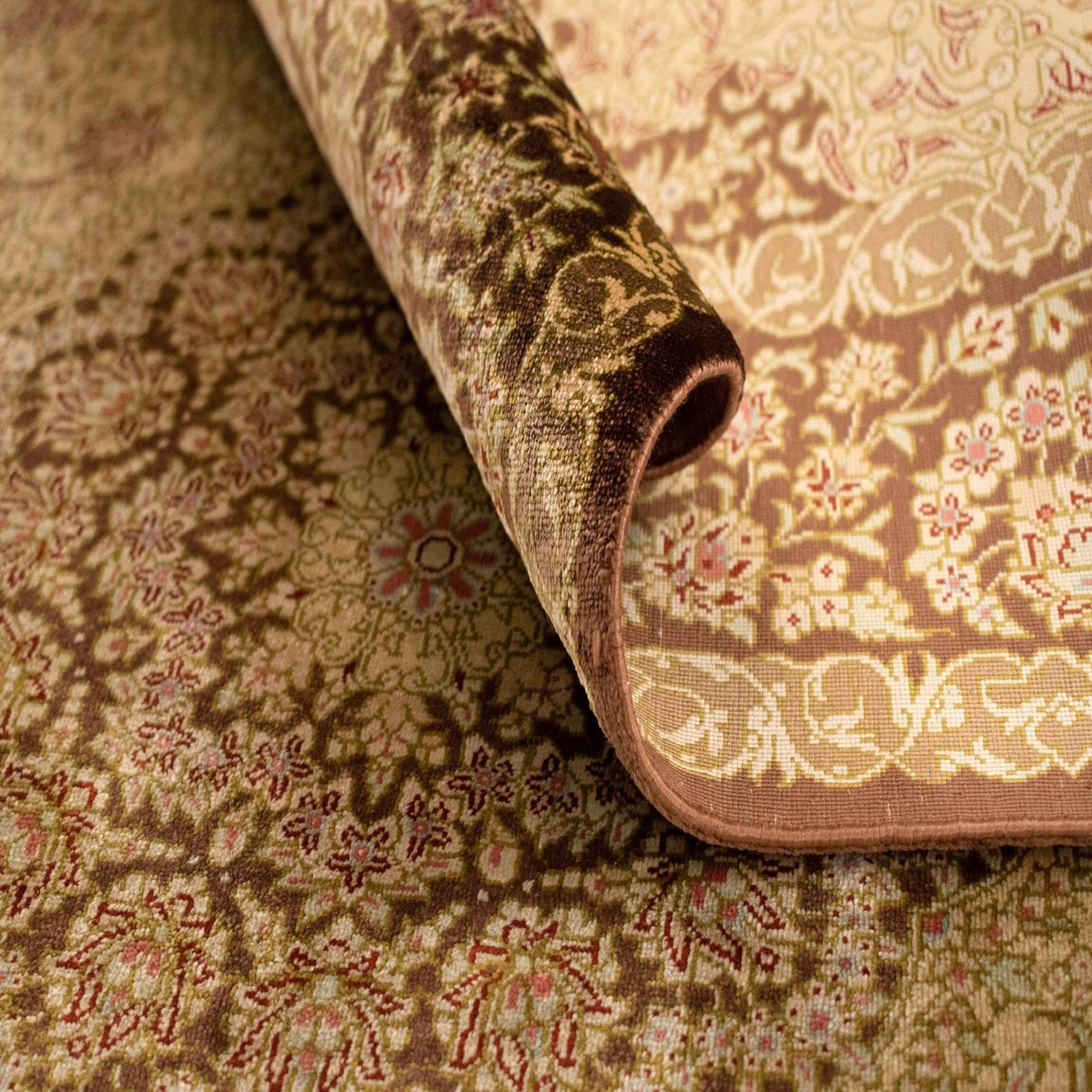 This Ghom Silk rug lends itself to a variety of decor settings. Its traditional design and rich color scheme make it a suitable focal point in a formal living room or dining area. It could also add a touch of sophistication to an office or study. The rug's intricate pattern works well with classic furniture pieces and can create a striking contrast when paired with more modern, minimalist interiors as an opulent accent.