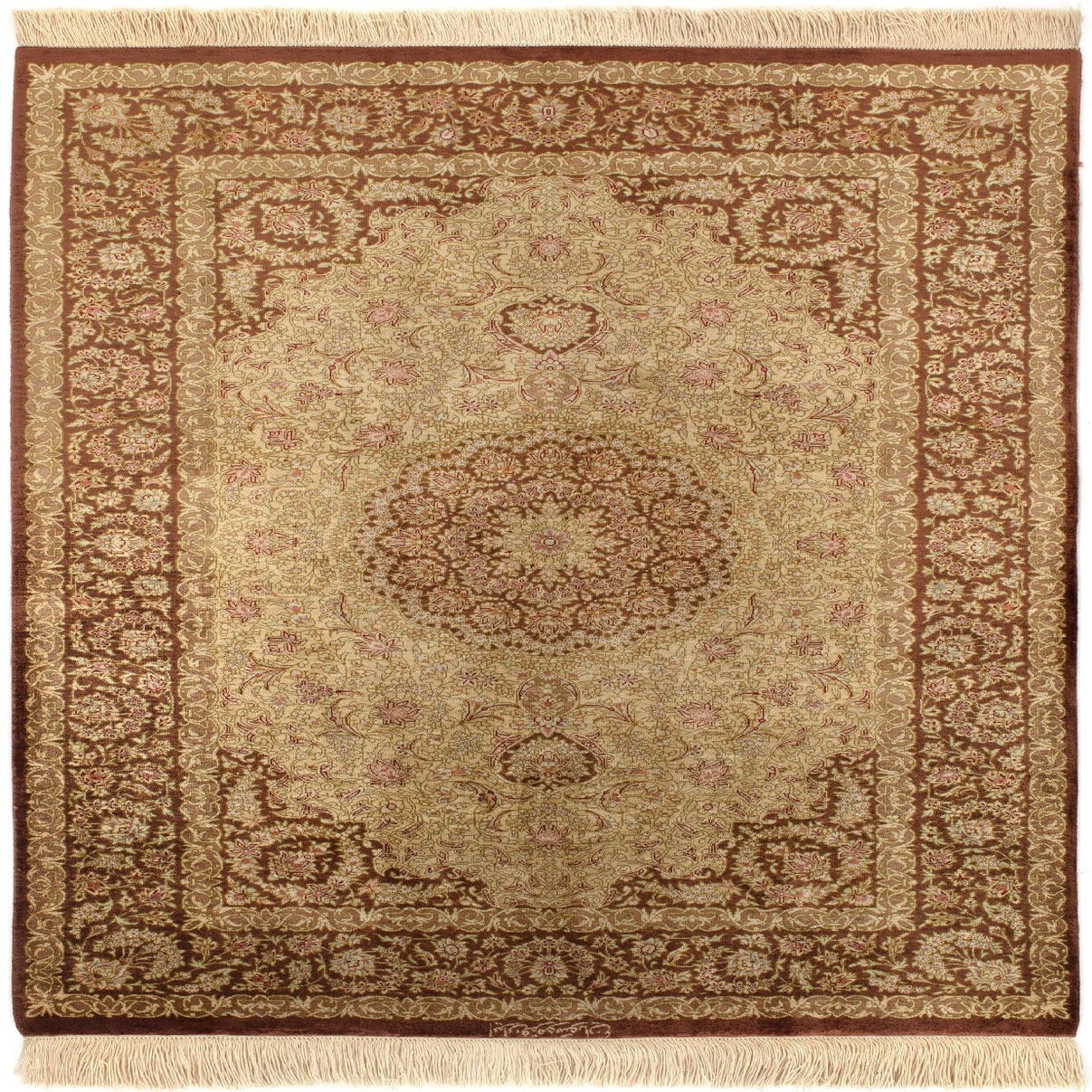 The Ghom Silk collection presents a hand-made silk rug measuring 3x4, crafted with precision and care. This piece showcases a sophisticated olive background, complemented by a harmonious palette of dark brown, green, and red detailing. Its intricate pattern features a central medallion surrounded by an elaborate array of floral motifs and accentuating borders, encapsulating the essence of traditional elegance.
