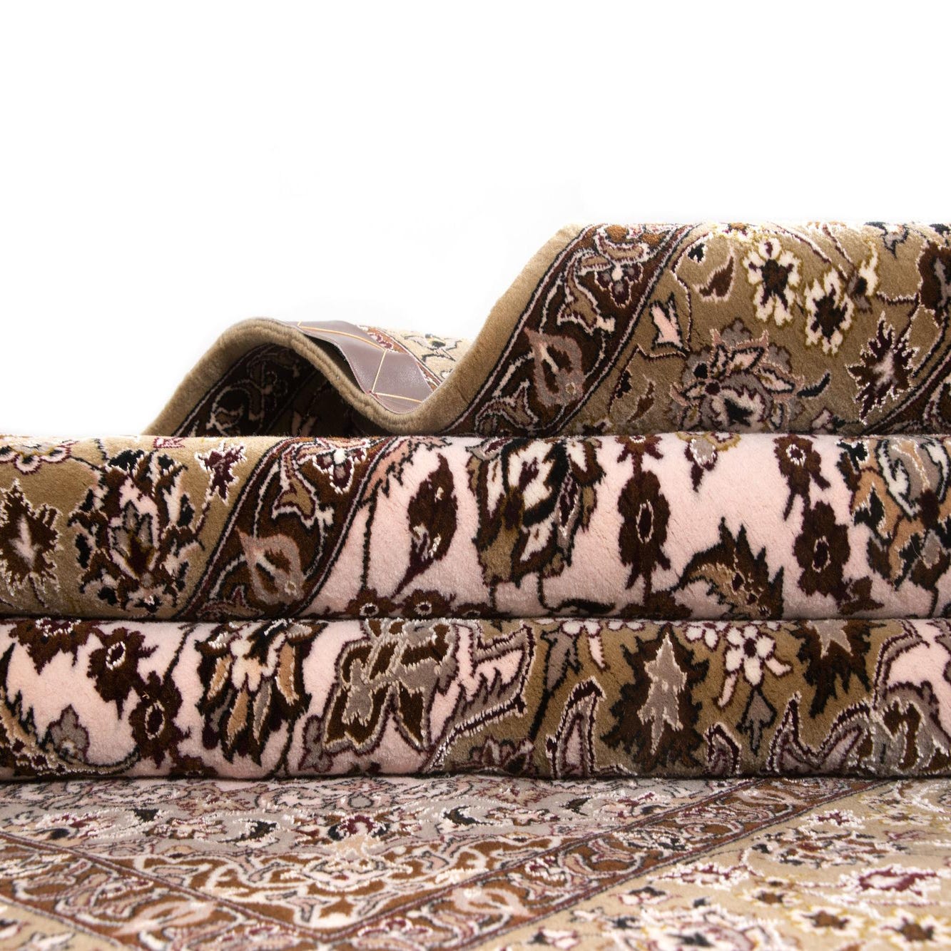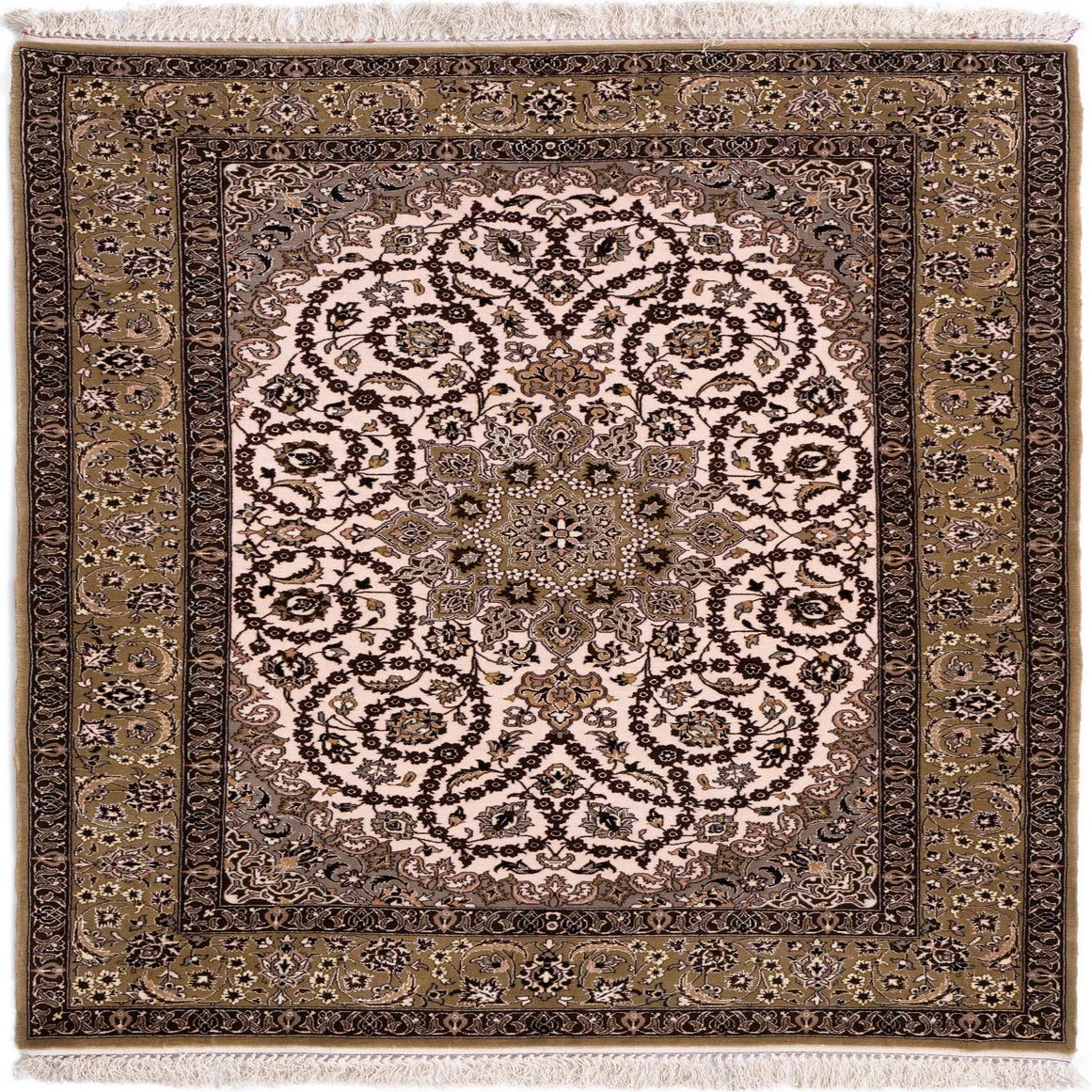 A 3x5 rectangular Isfahan Persian rug with a light center medallion and intricate floral patterns in greens and browns, surrounded by a dark green border.