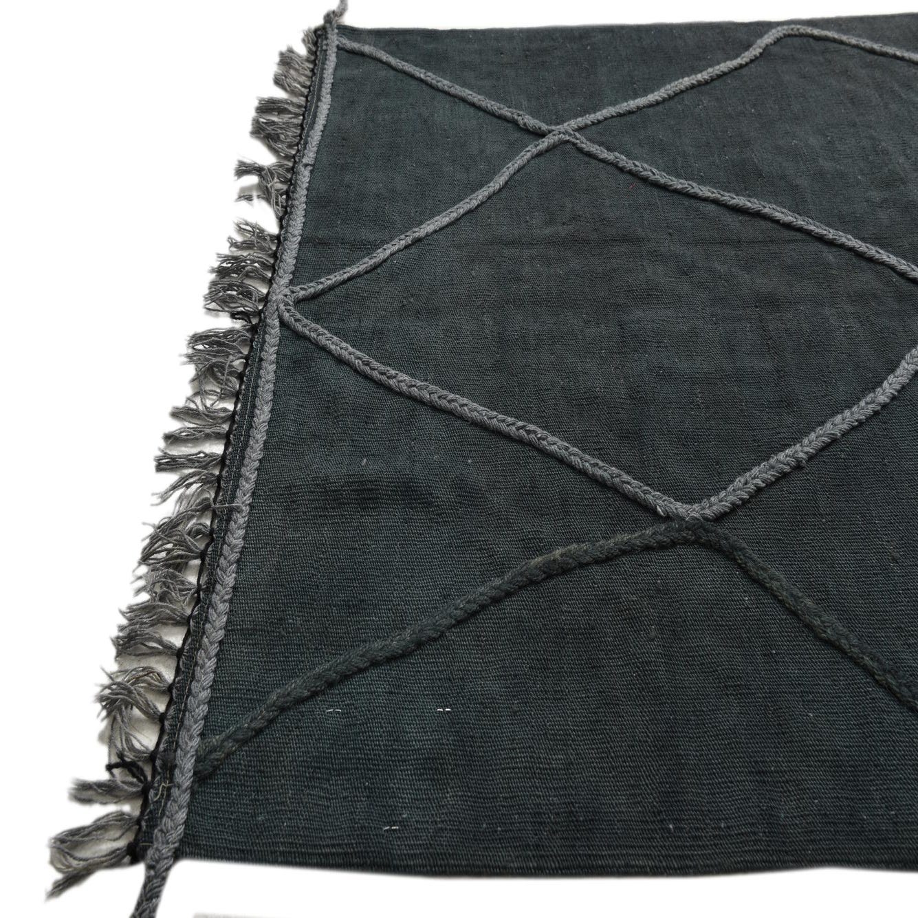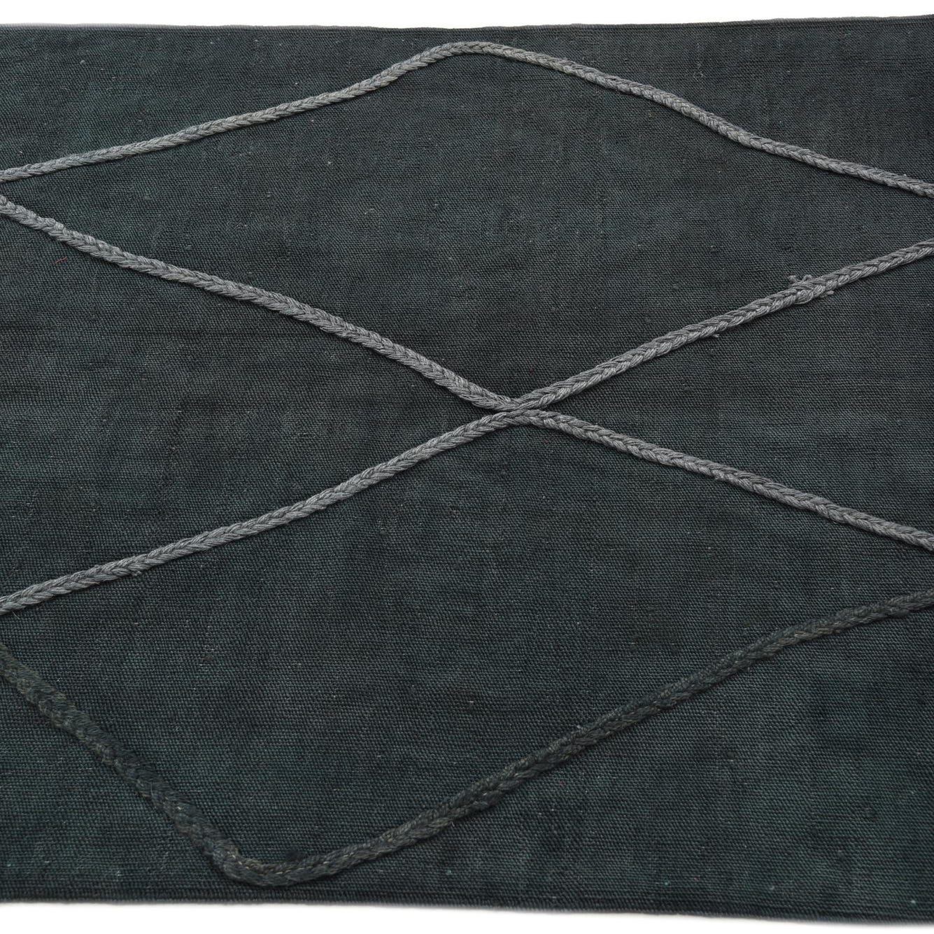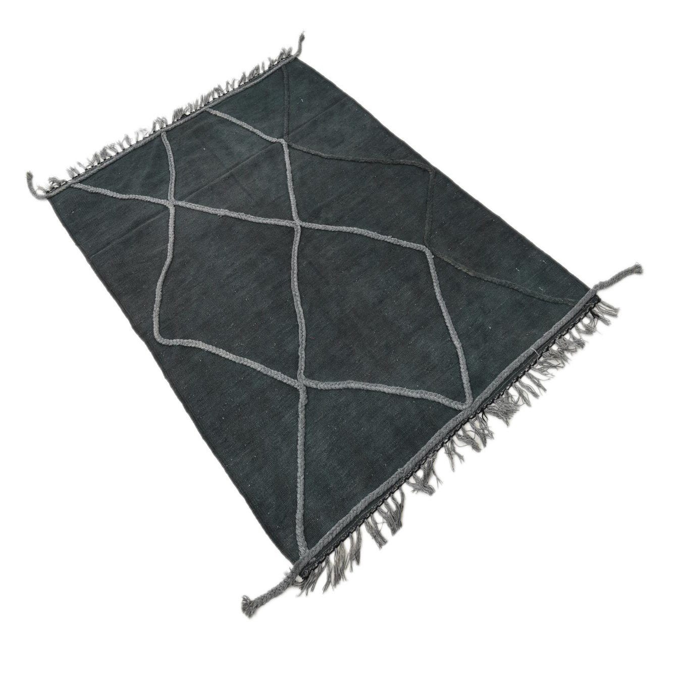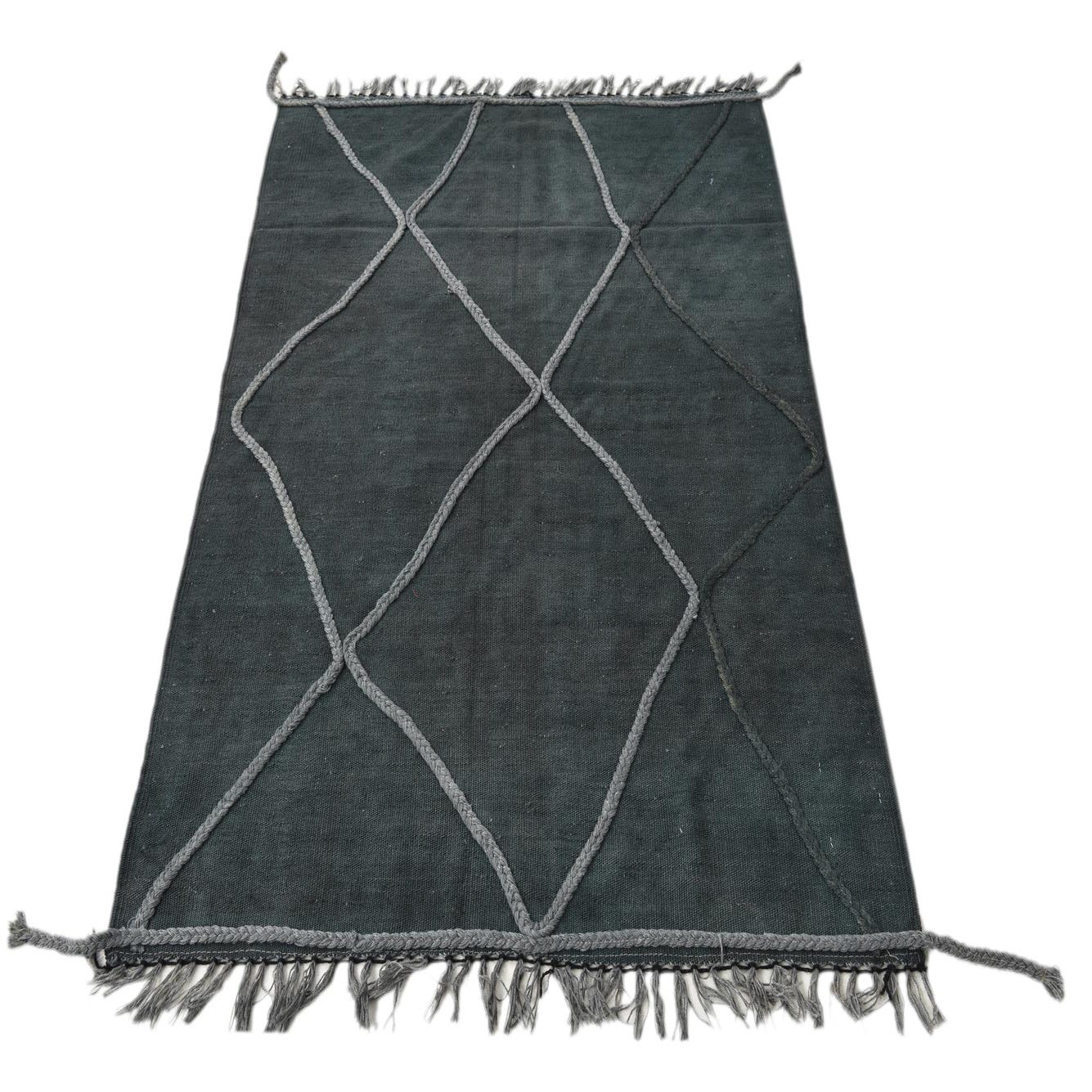 A 3x5 rectangular green wool Kilim Modern rug with a grey braided diamond pattern and fringed ends.