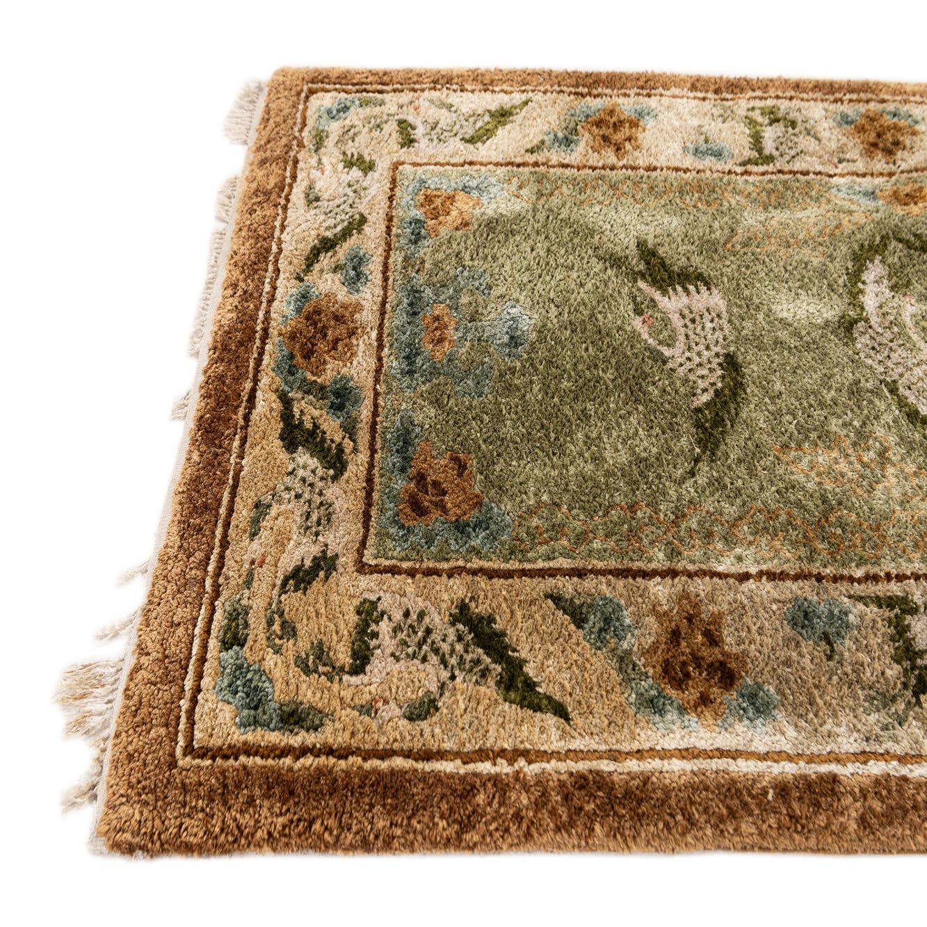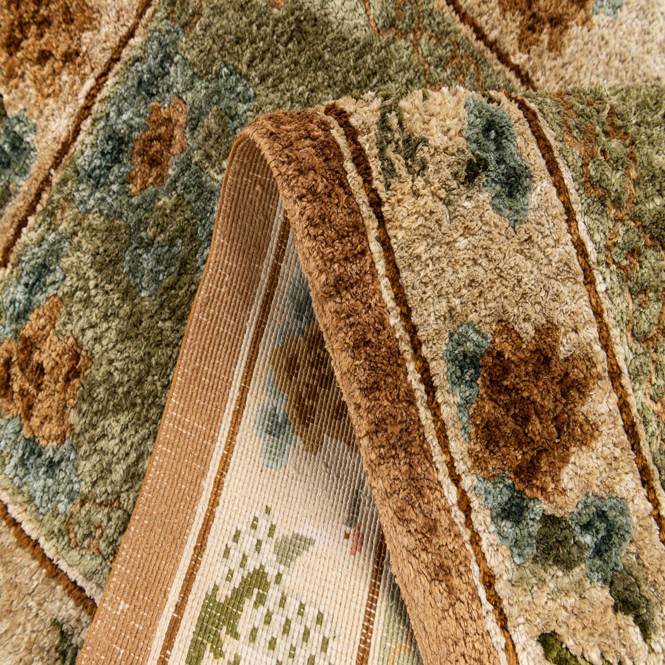 Primary color is Olive. Colors in this rug include: Olive, Blue, Cream, Gold, Brown, Navy Blue.