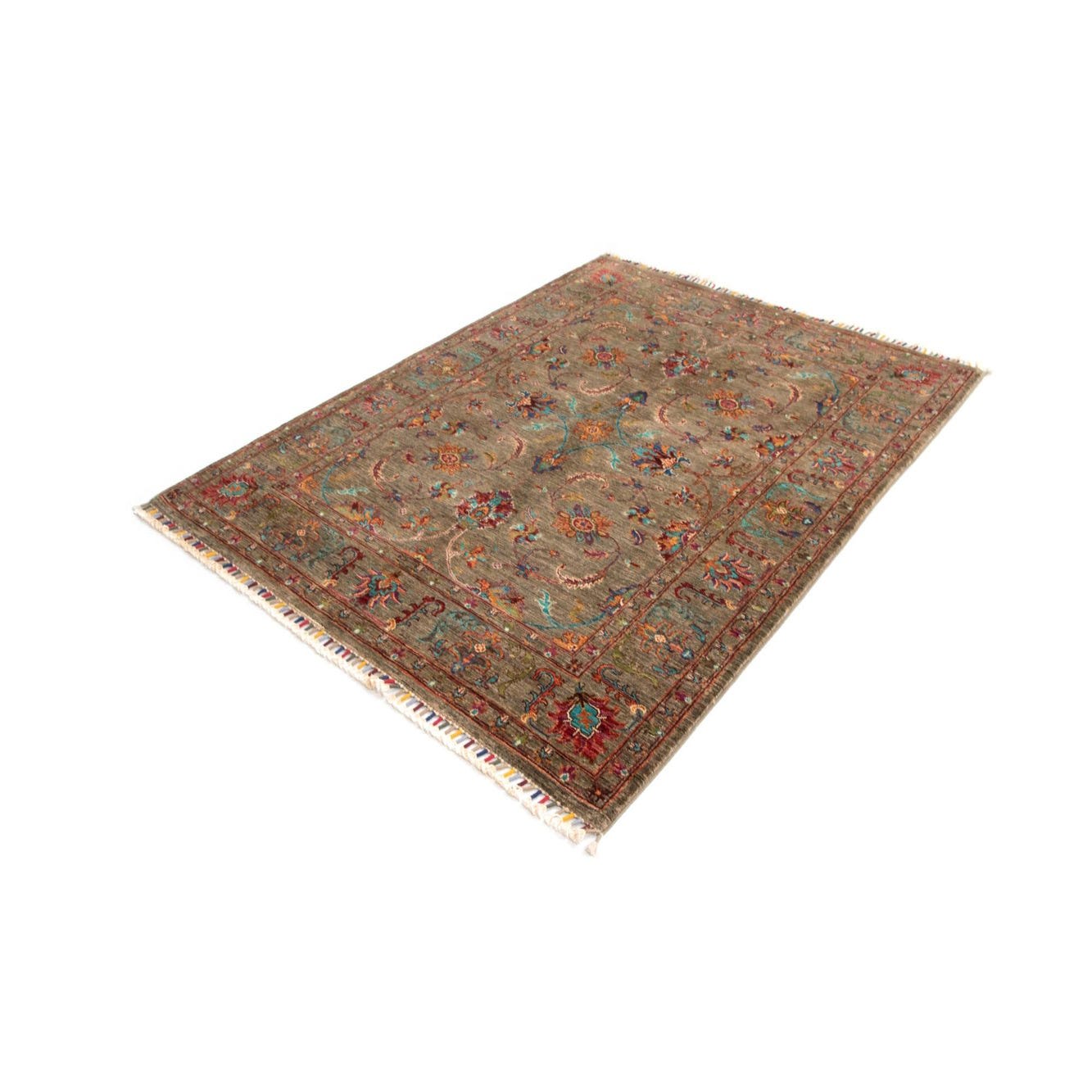 The Ariana collection rug is a handcrafted piece with a 4x6 dimension, made of 100% wool, demonstrating both durability and comfort underfoot. This rug showcases a rich olive backdrop complemented by an intricate pattern that includes hues of green, orange, and dark blue. The ornate design features traditional motifs which add a sense of timeless elegance to the piece.
