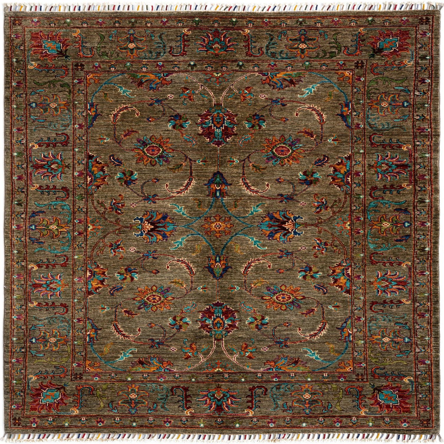 Primary color is Olive. Colors in this rug include: Olive, Green, Orange, Dark Blue.