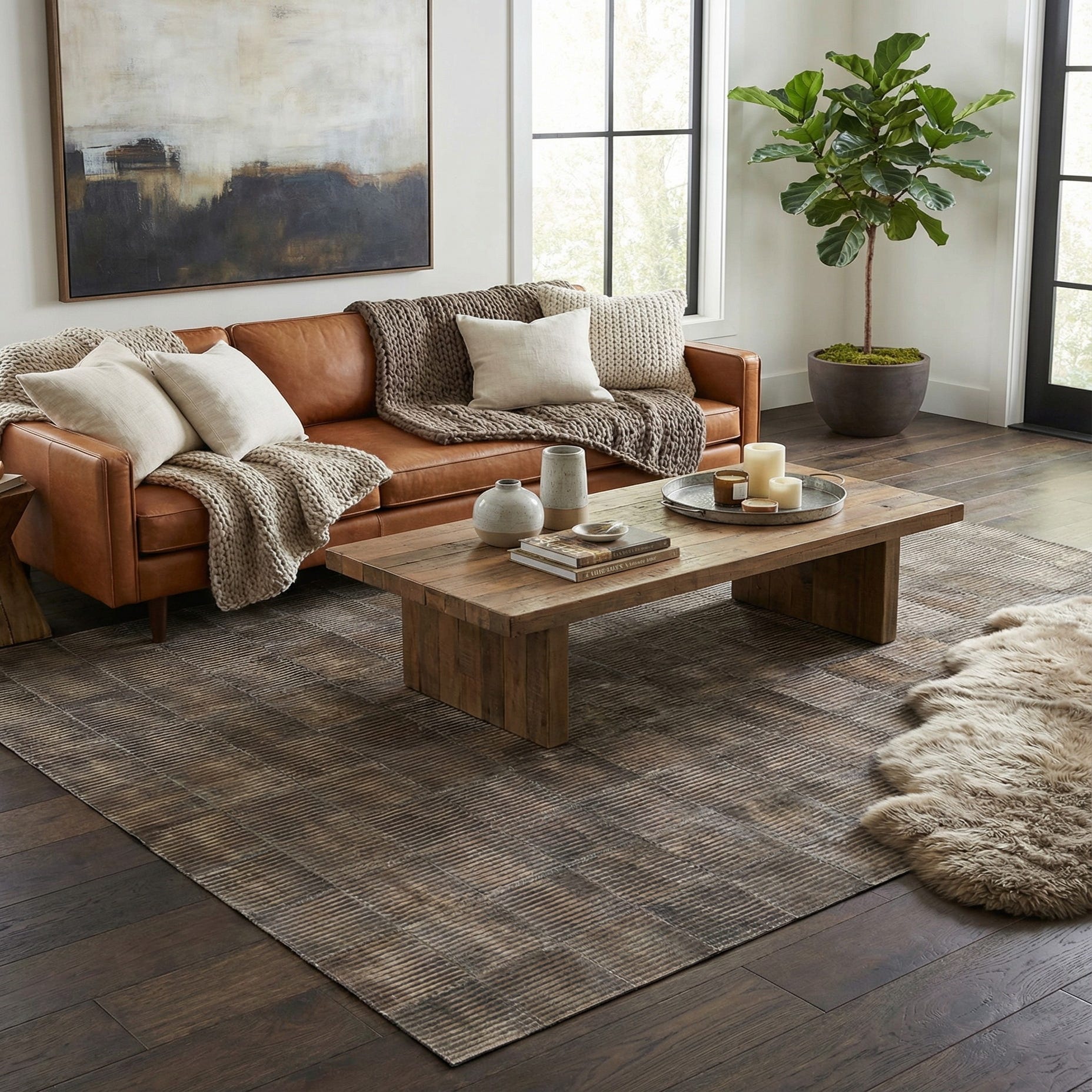 The restrained palette and linear pattern suit contemporary, industrial, or modern-rustic interiors. Use it to anchor a seating area beneath a coffee table, to add texture in a home office, or layered over wood floors for added visual interest. It complements warm wood tones, matte black metal accents, leather upholstery, and neutral linens, making it an adaptable choice for layered, composed spaces.