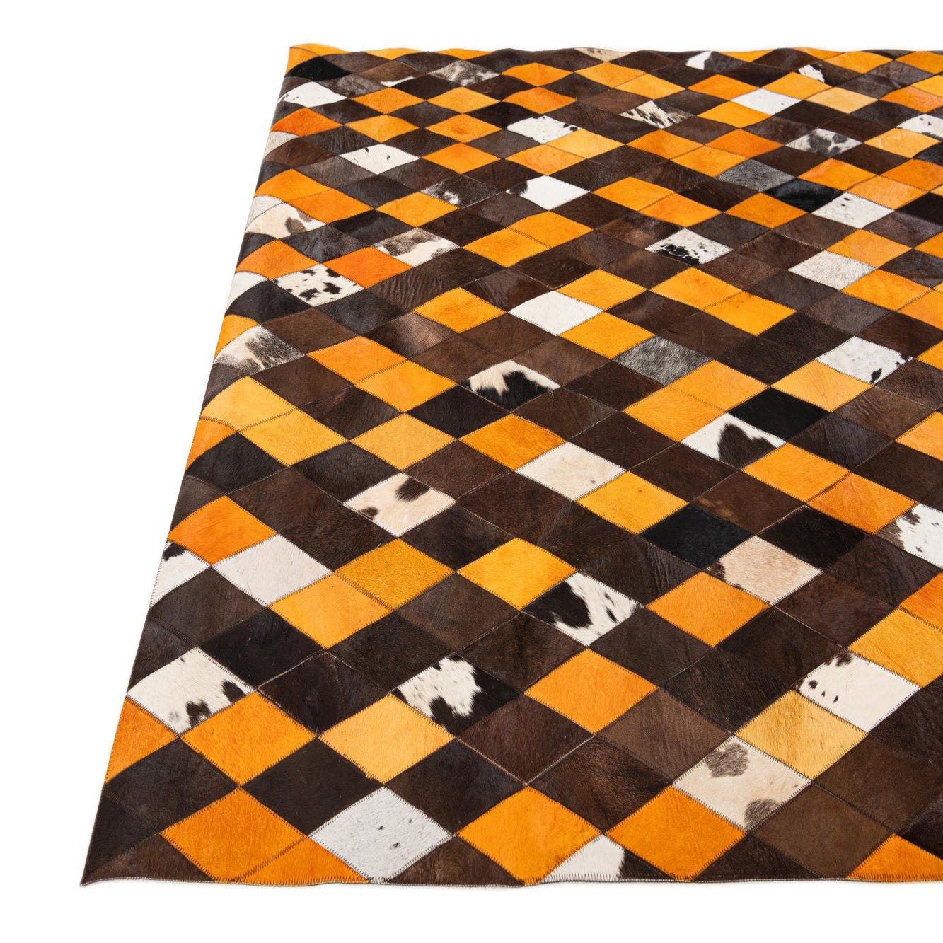 A rectangular 5x8 modern cowhide rug featuring a diamond pattern in shades of green, brown, and white.