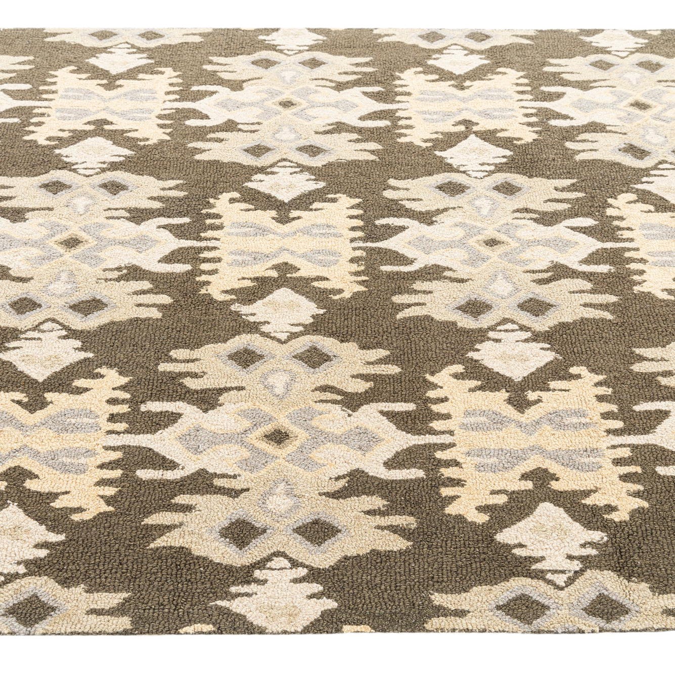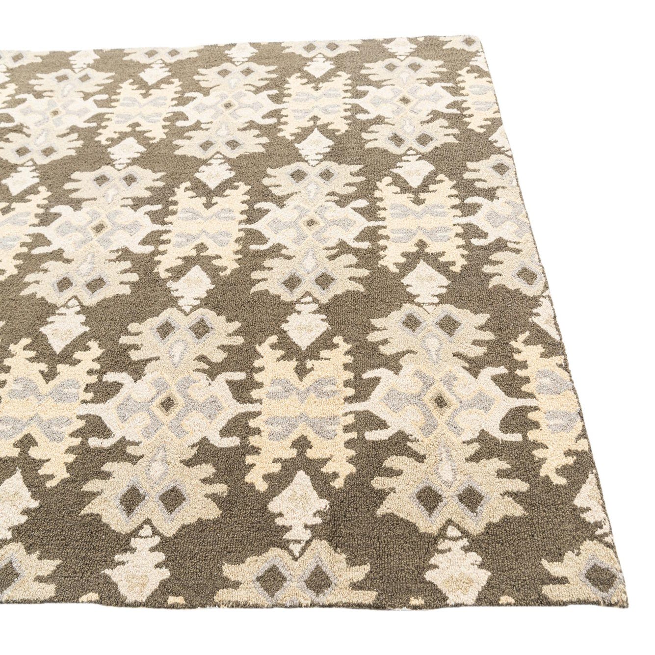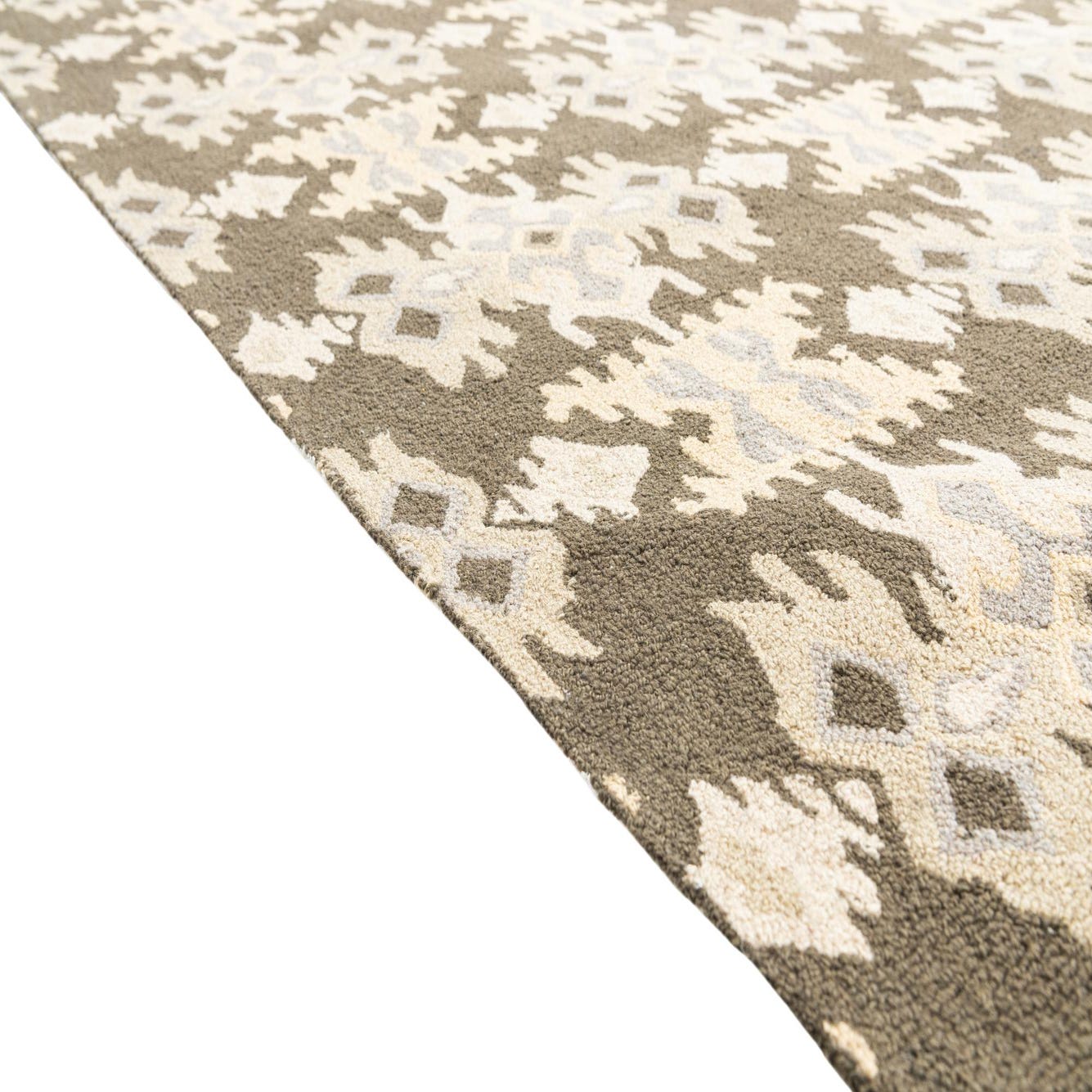 Primary color is Olive. Colors in this rug include: Olive, Tan, Gray.