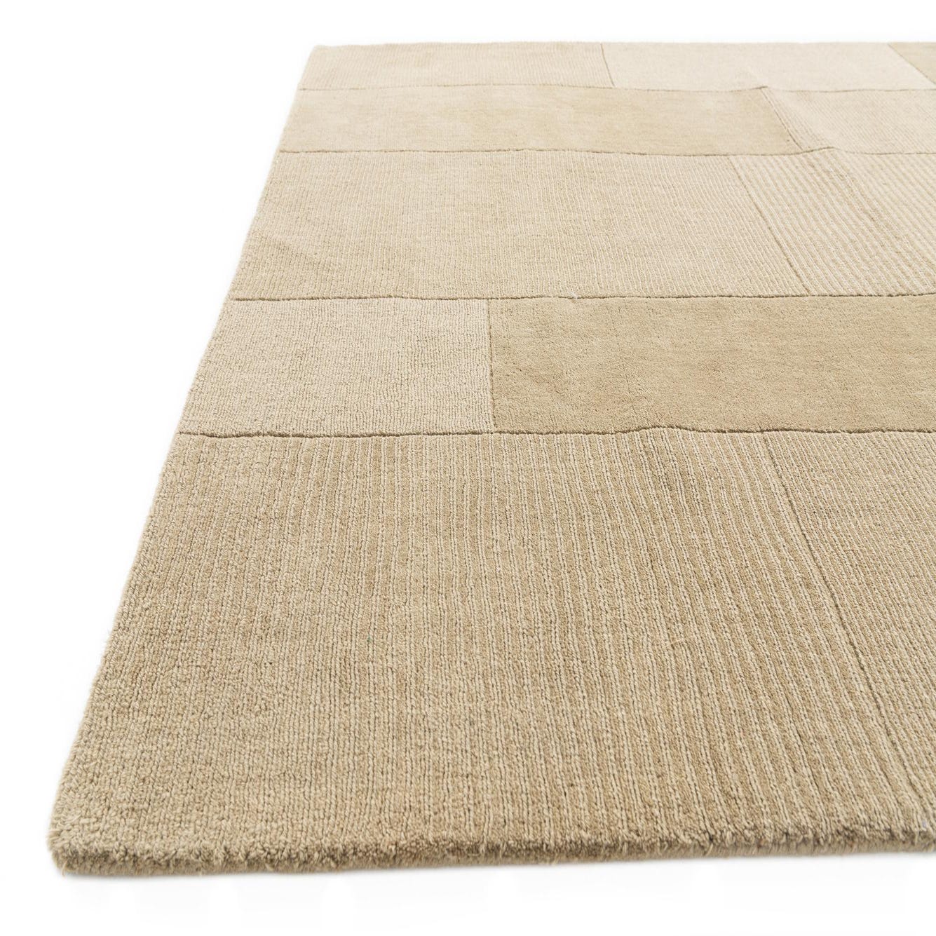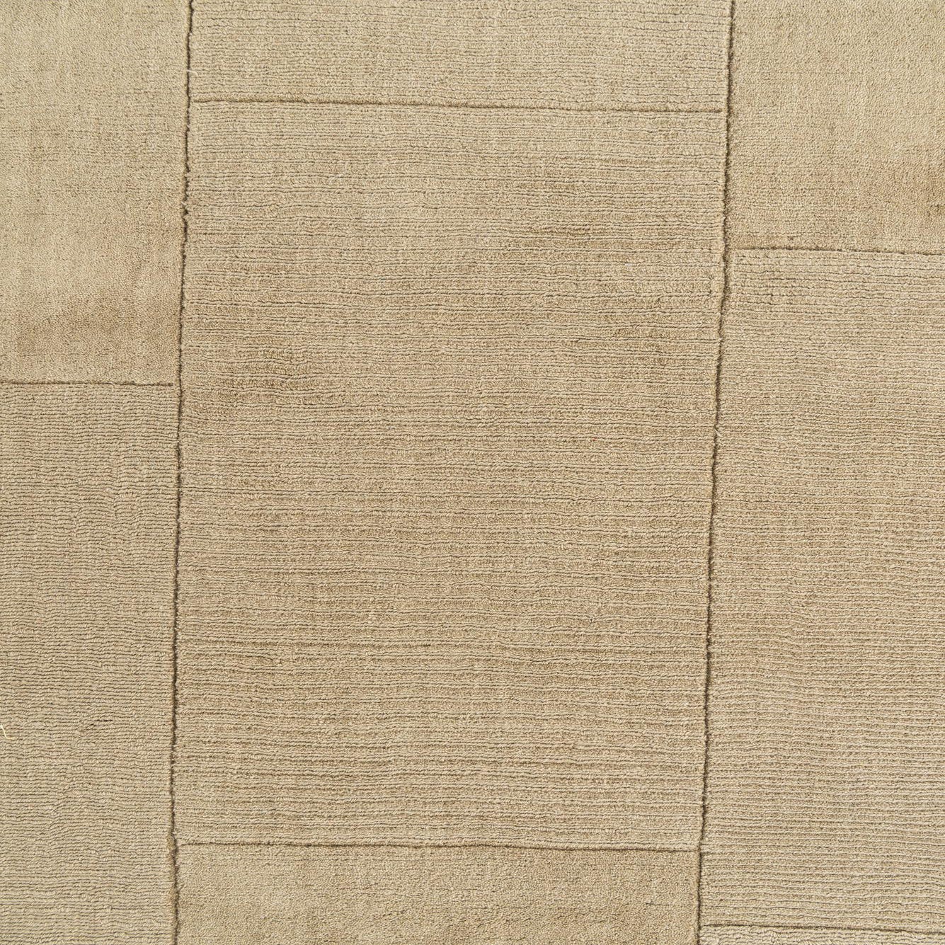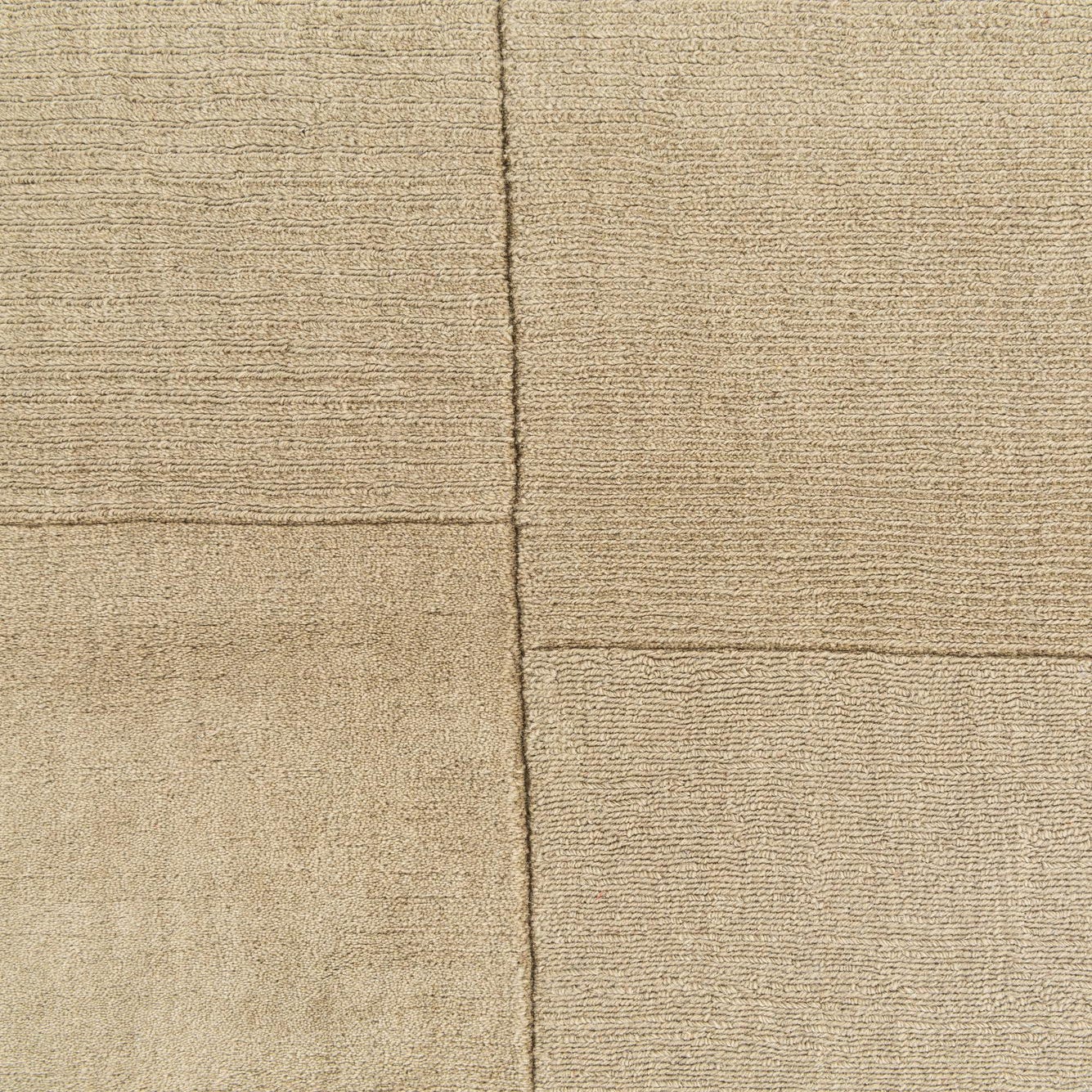Hand-tufted from wool and cotton, this rug has a calm, architectural presence. Rectangular panels are arranged in a subtle patchwork of long and short strips, with alternating pile finishes—smooth, cut-pile panels that pick up a soft sheen and tighter, ribbed sections that add a fine linear texture underfoot. The background is olive, with slight tonal shifts between panels that create depth without high contrast, resulting in a quietly layered look and a low-profile, tactile surface.