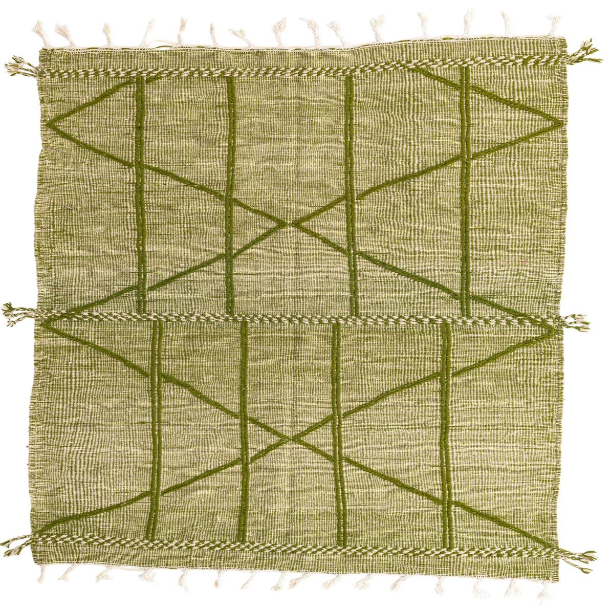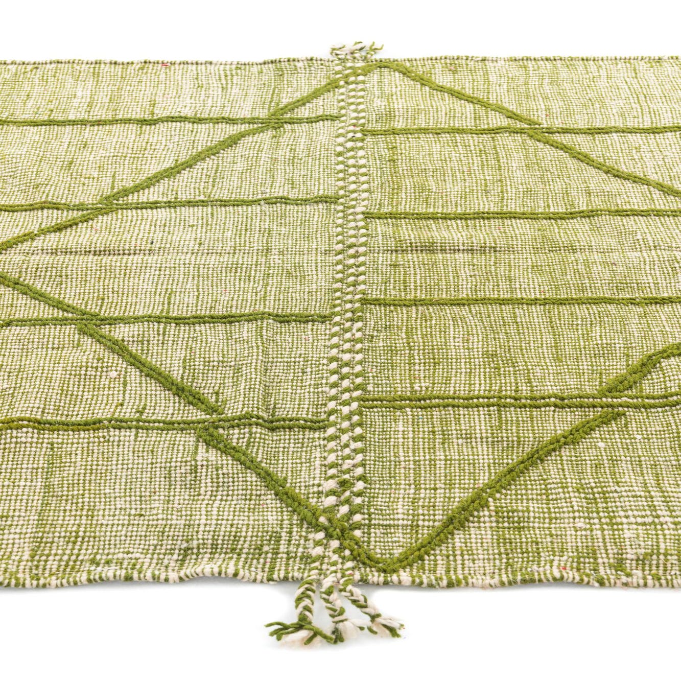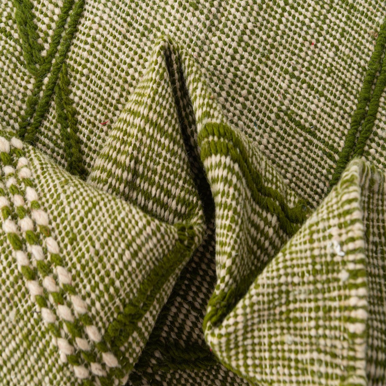 An olive field anchors a clean, geometric design of vertical lines, X motifs and angled triangles rendered in ivory. The pattern is created with slightly raised wool yarns that contrast against a low, open-weave ground, giving the surface a tactile, hand-crafted quality. Hand-knotted from 100% wool, the rug has a natural, soft hand and visible knotted fringe that add casual texture and visual warmth.