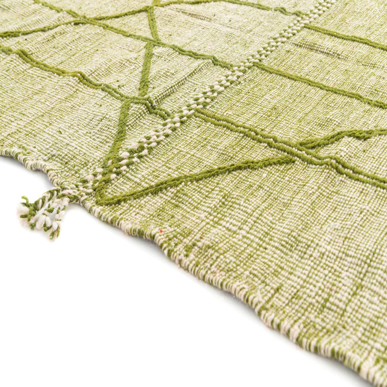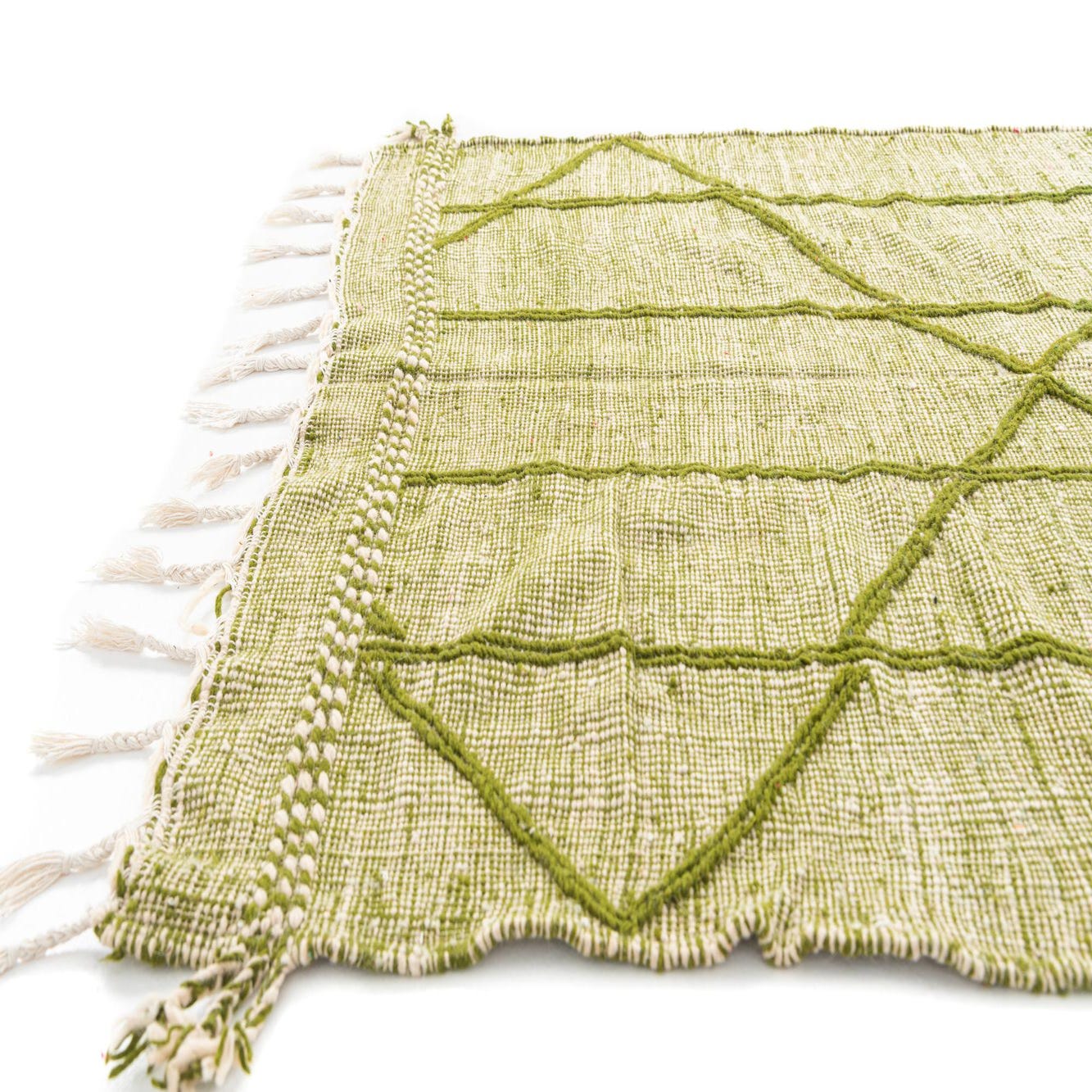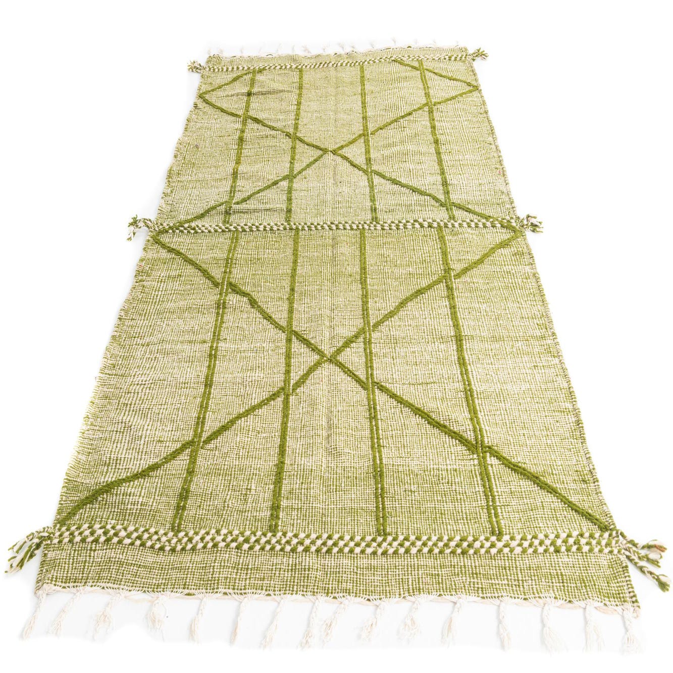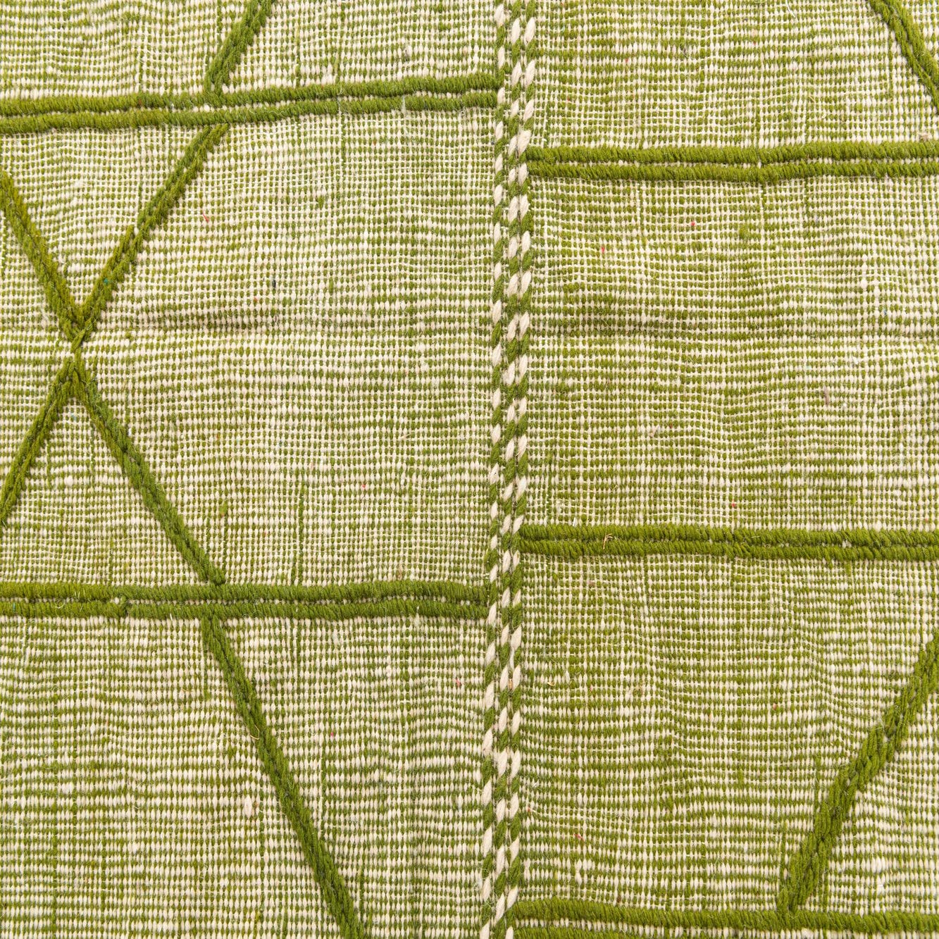An olive field anchors a clean, geometric design of vertical lines, X motifs and angled triangles rendered in ivory. The pattern is created with slightly raised wool yarns that contrast against a low, open-weave ground, giving the surface a tactile, hand-crafted quality. Hand-knotted from 100% wool, the rug has a natural, soft hand and visible knotted fringe that add casual texture and visual warmth.