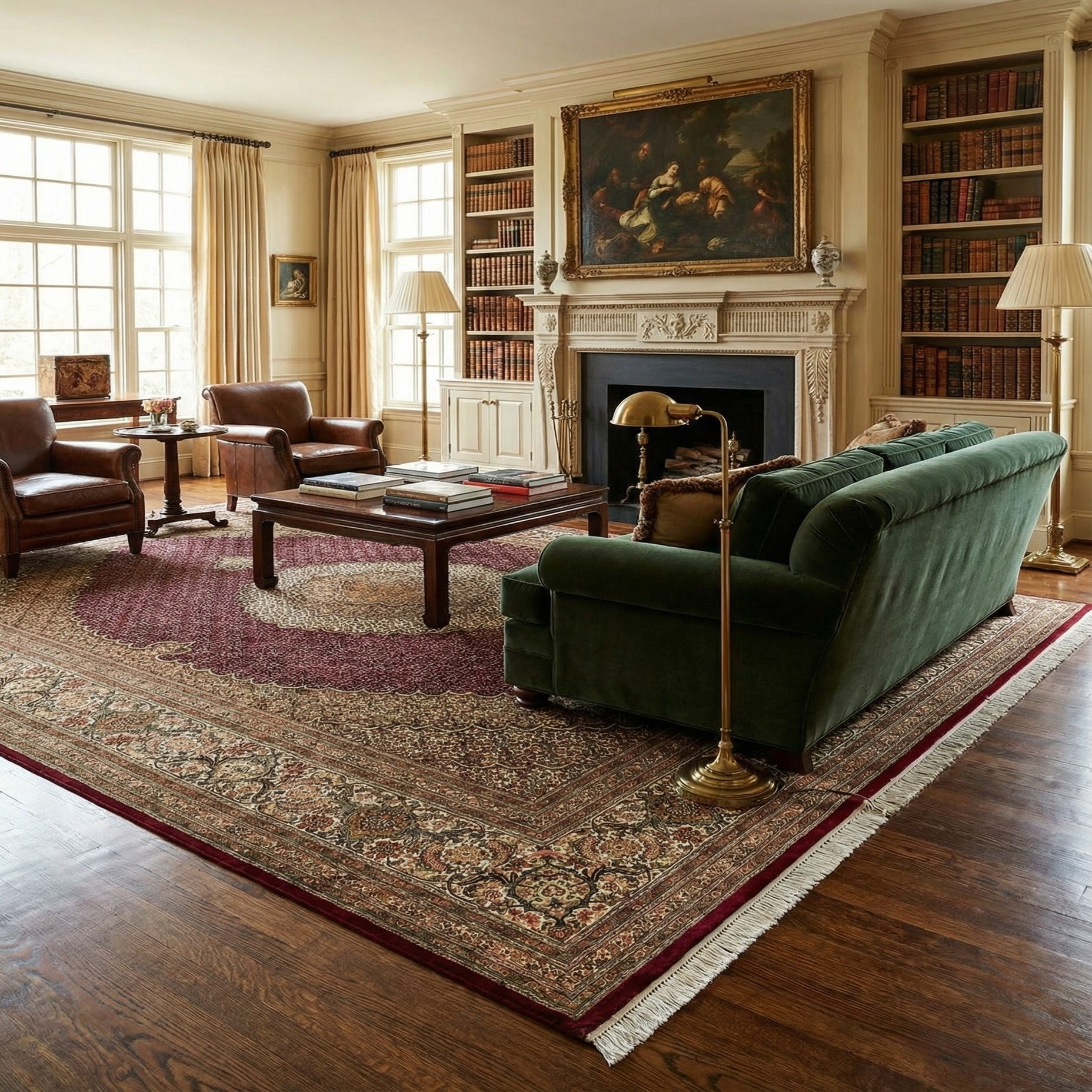 A 6x9 rectangular Persian rug with a central medallion, featuring intricate green, red, and cream patterns on a dark red field.