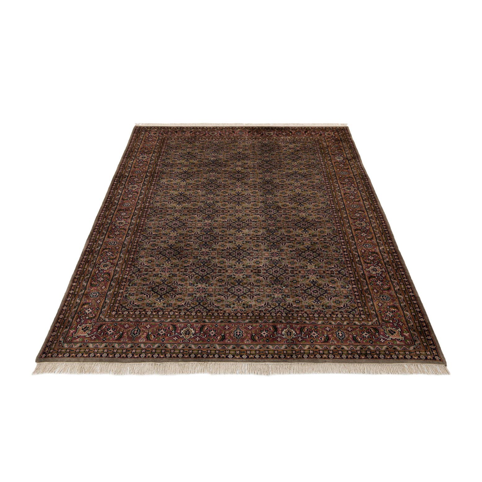A 7x10 rectangular Farahan rug featuring an intricate green, brown, and pink floral oriental pattern with a detailed border and fringe.