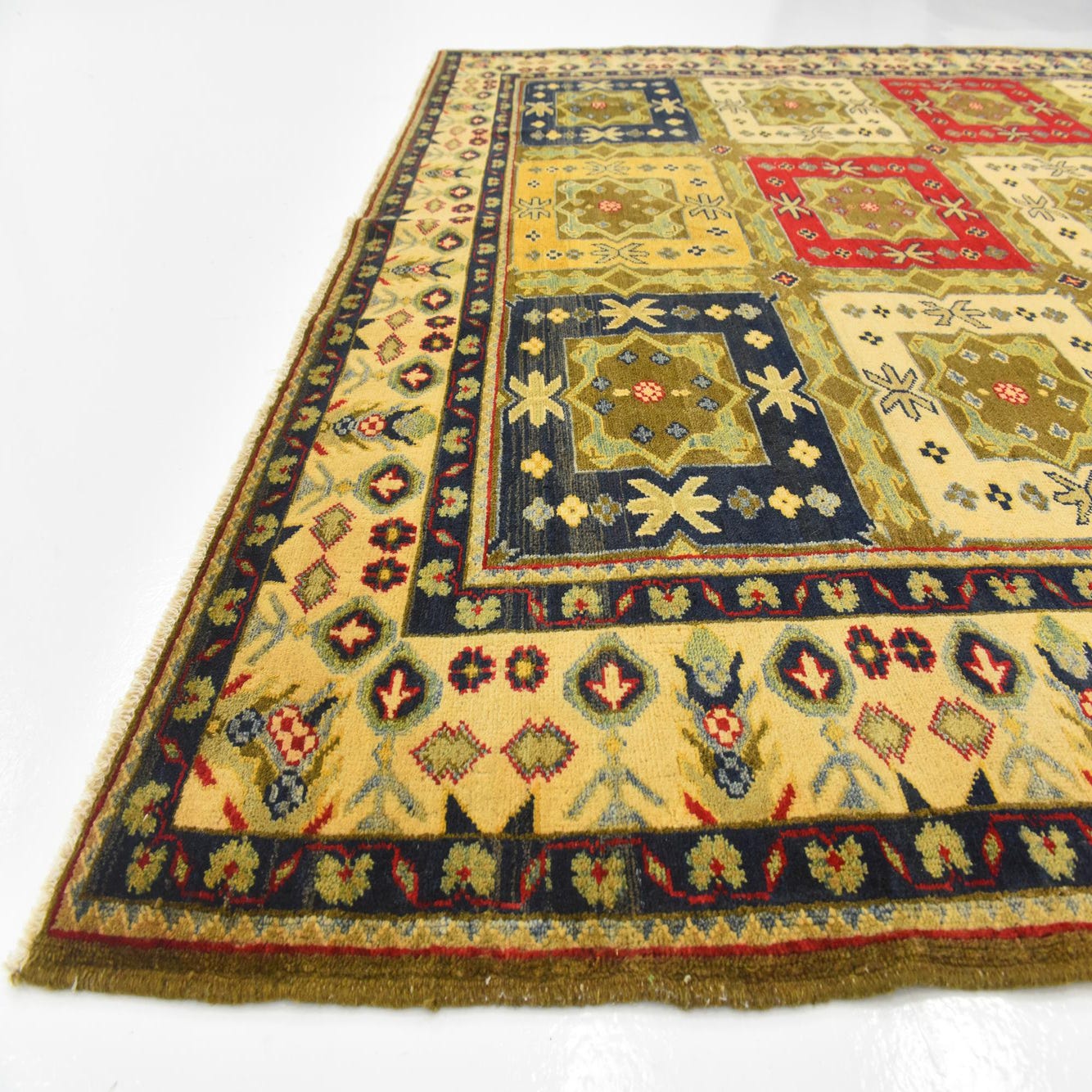 A 7x10 rectangular Kazak rug with a traditional tribal pattern featuring a grid of squares in green, red, yellow, and navy, framed by a detailed border.