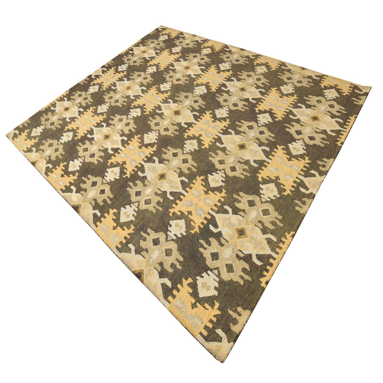 A rectangular 8x10 Luna rug featuring a repeating geometric pattern in shades of green, gold, and beige on a dark green background.